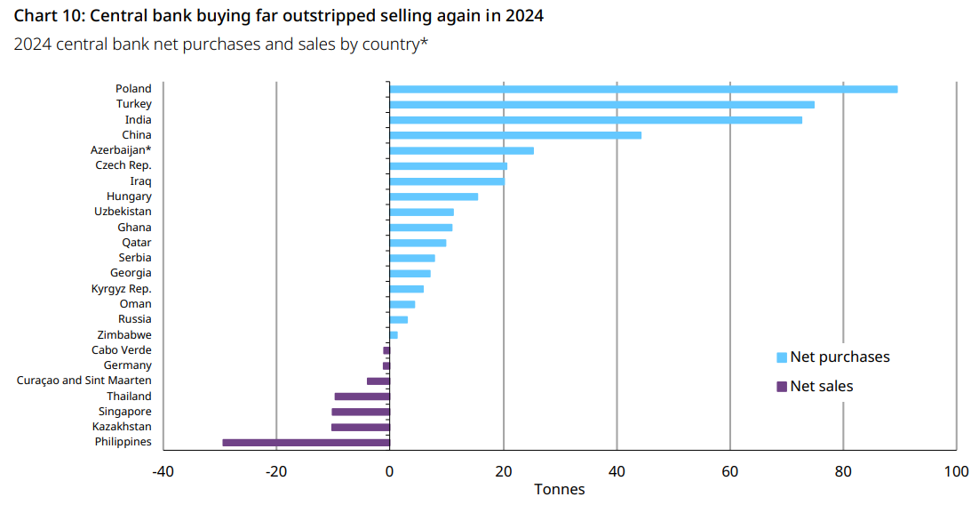 Dünya Altın Konseyi’nin son raporuna göre merkez bankaları 2024 yılında küresel altın talebinde önemli bir rol oynadı. Peki, geçtiğimiz yıl kasasına en fazla altın ekleyen ülkeler hangileri oldu? İşte detaylar.. Dünya Altın Konseyi’nin 2024 yılı Altın Trendleri raporuna göre 2024 yılında küresel altın talebi bir önceki yıla göre yüzde 1 artarak 4.974 ton ile rekor seviyeye ulaştı. Bu yükselişin ise özellikle Trump'ın seçim zaferinin netleştiği yılın son çeyreklik bölümünde gerçekleştiği görüldü. [news_id:761381] Merkez bankalarının da altın rezervlerini artırma eğiliminde olduğu bu dönemde, rezervlerine en fazla ekleme yapan ülke ise Polonya oldu. Polonya’yı Türkiye ve Hindistan takip etti. 2024 itibarıyla merkez bankalarının kasasına en fazla altın ekleyen 10 ülke ise şöyle sıralandı: Polonya Polonya, 2024 yılında 89,50 ton net altın alımıyla dünya genelinde merkez bankası rezervlerine en fazla altın alan ülke oldu. Polonya böylelikle altın rezervlerini 448 tona çıkararak kasasında en fazla altın tutan 13. ülke oldu. Türkiye Türkiye Cumhuriyeti Merkez Bankası (TCMB) ise 74,80 ton net altın alımıyla ikinci sırada yer aldı. TCMB’nin bu alımları, Türkiye’nin resmi altın rezervlerini 615 tona çıkararak dünya sıralamasında 10. sıraya yükselmesini sağladı. Hindistan Hindistan Merkez Bankası ise 72,60 ton altın alımıyla listede kendisine üçüncü sıradan yer buldu. Böylelikle Hindistan, hem merkez bankası alımları hem de tüketici talebiyle küresel altın piyasasında önemli bir aktör olmayı sürdürdü. Çin Dünyanın en büyük altın tüketici olarak nitelendirilen Çin ise 44,20 ton altın alımıyla 2024 yılında dördüncü sırada yer aldı. Çin’in altın rezervleri 2024 sonu itibarıyla 2.279,6 tona ulaşarak dünya genelinde altıncı sırada konumlandı. Azerbaycan Türkiye’nin ikinci sırada yer aldığı listede kardeş ülke Azerbaycan ise 25 ton altın alımıyla beşinci sıradan kendisine yer buldu. Çekya Çekya, 20,50 ton altın alımıyla altıncı sırada yer alırken ülke 2024 yılındaki alımlarıyla birlikte toplam altın rezervini yüzde 66 artışla 50 tonun üzerine taşıdı. Irak Irak, 20,10 ton altın alımıyla 2024 yılında en fazla altın alımı yapan yedinci ülke olurken Irak Merkez Bankası’nın bu hamlesi ülkenin ekonomik istikrar arayışının bir parçası olarak yorumlandı. Macaristan Macaristan ise 15,50 ton altın alımıyla sekizinci sırada yer aldı. Macaristan son alımıyla birlikte toplam rezervini 110 tona çıkardı. Özbekistan Özbekistan, 11,20 ton altın alımıyla dokuzuncu sıraya yerleşirken ülkenin toplam rezervi 382 tona çıktı. Böylelikle Özbekistan, kasasında en fazla altın bulunan 16. ülke konumuna ulaştı. Gana Gana ise 11,00 ton altın alımıyla onuncu sırada yer aldı. Gana Merkez Bankası’nın bu hamlesi, ülkenin altın rezervlerini artırma çabalarının bir göstergesi olarak değerlendirildi. Kaynak: Dünya Altın Konseyi ABD altın rezervinde liderliğini koruyor 2024 yılındaki alım ve satımların ardından küresel çapta kasasında en fazla altın bulunduran ülkeler ise 8 bin 133 ton ile ABD, 3 bin 351 ton ile Almanya, 2 bin 451 ton ile İtalya, 2 bin 437 ton ile Fransa, 2 bin 335 ton ile Fransa olarak sıralandı. [news_id:761372]
