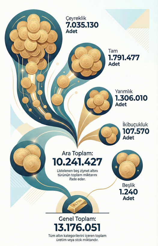Türkiye'de geçen yıl Darphane tarafından basılan altın miktarları açıklandı. İşte Darphane'nin 2025 karnesi.. Darphane ve Damga Matbaası Genel Müdürlüğü verilerine göre, 2025 yılında çeşitli türlerde toplam 13 milyon 176 bin 51 adet altın üretildi. Geçen yıl basılan toplam altının 10 milyon 241 bin 427 adedi ziynet grubunda yer alırken, 2 milyon 556 bin 157 adedi sikke cumhuriyet altınlarından meydana geldi. En çok çeyrek altın basıldı Toplamda 13 milyon adedi geçen üretim süreci için 49 ton 715 kilogram 513,8 gram altın kullanıldığı açıklandı. Ziynet cumhuriyet altınları içerisinde yer alan çeyrek altın, 7 milyon 35 bin 130 adetlik üretimle tüm kategorilerde en çok basılan tür oldu. Bunu 1 milyon 791 bin 477 adetle tam ziynet ve 1 milyon 306 bin 10 adetle yarım ziynet altın takip etti. Ziynet grubundaki toplam üretim ağırlığı ise 31 ton 402 kilogramı geçti. Sikke grubunda tam altın öne çıktı Sikke cumhuriyet altınları kategorisinde ise en fazla ilgi gören tür tam altın oldu. Geçen yıl 2 milyon 202 bin 220 adet tam sikke basılırken, çeyrek sikke üretimi 280 bin 245 adette kaldı. Sikke grubunda üretilen toplam 2,5 milyonun üzerindeki altının toplam ağırlığı 17 ton 189 kilogram seviyesinde gerçekleşti. Ayrıca Reşad altın kategorisinde 40 bin 289 adet üretim yapılırken, piyasaya çeşitli gramlarda 338 bin 178 adet darphane altını sürüldü. [news_id:797570]