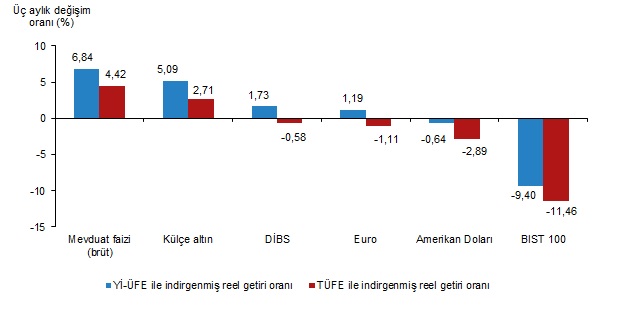 Türkiye İstatistik Kurumu (TÜİK), ağustos ayında enflasyon ile indirgendiğinde en yüksek reel getirinin külçe altında olduğunu açıkladı. Türkiye İstatistik Kurumu (TÜİK), ağustos ayına ilişkin finansal yatırım araçlarının reel getiri oranlarını açıkladı. Aylık en yüksek reel getiri, yurt içi üretici fiyat endeksi (Yİ-ÜFE) ile indirgendiğinde %4,82, tüketici fiyat endeksi (TÜFE) ile indirgendiğinde ise %4,01 oranlarıyla külçe altında gerçekleşti. Yİ-ÜFE ile indirgendiğinde; yatırım araçlarından Euro %2,18, mevduat faizi (brüt) %1,64 ve Amerikan Doları %0,60 oranlarında yatırımcısına reel getiri sağlarken; Devlet İç Borçlanma Senetleri (DİBS) %0,68 ve BIST 100 endeksi %10,07 oranlarında yatırımcısına kaybettirdi. TÜFE ile indirgendiğinde ise; Euro %1,40 ve mevduat faizi (brüt) %0,86 oranlarında yatırımcısına reel getiri sağlarken; Amerikan Doları %0,18, DİBS %1,44 ve BIST 100 endeksi %10,76 oranlarında yatırımcısına kaybettirdi. Kaynak: TÜİK Mevduat faizi (brüt), üç aylık değerlendirmede; Yİ-ÜFE ile indirgendiğinde %6,84, TÜFE ile indirgendiğinde ise %4,42 oranlarında yatırımcısına en yüksek reel getiri sağlayan yatırım aracı oldu. Aynı dönemde BIST 100 endeksi, Yİ-ÜFE ile indirgendiğinde %9,40, TÜFE ile indirgendiğinde ise %11,46 oranlarında yatırımcısına en çok kaybettiren yatırım aracı oldu. Kaynak: TÜİK Altı aylık değerlendirmeye göre külçe altın; Yİ-ÜFE ile indirgendiğinde %14,30, TÜFE ile indirgendiğinde ise %10,77 oranlarında yatırımcısına en yüksek reel getiri sağlayan yatırım aracı olurken; aynı dönemde Amerikan Doları, Yİ-ÜFE ile indirgendiğinde %4,68, TÜFE ile indirgendiğinde ise %7,62 oranlarında yatırımcısına en çok kaybettiren yatırım aracı oldu. Kaynak: TÜİK Finansal yatırım araçları yıllık olarak değerlendirildiğinde külçe altın; Yİ-ÜFE ile indirgendiğinde %18,15, TÜFE ile indirgendiğinde ise %5,54 oranlarında yatırımcısına en yüksek reel getiri sağlayan yatırım aracı oldu. Yıllık değerlendirmede, Yİ-ÜFE ile indirgendiğinde; yatırım araçlarından BIST 100 endeksi %3,58, Euro %7,30, Amerikan Doları %8,12, mevduat faizi (brüt) %11,20 ve DİBS %24,61 oranlarında yatırımcısına kaybettirdi. TÜFE ile indirgendiğinde BIST 100 endeksi %13,87, Euro %17,19, Amerikan Doları %17,92, mevduat faizi (brüt) %20,68 ve DİBS %32,66 oranlarında yatırımcısına kaybettirdi. Kaynak: TÜİK [news_id:744657] [news_id:744635] [news_id:744741] [news_id:744686]