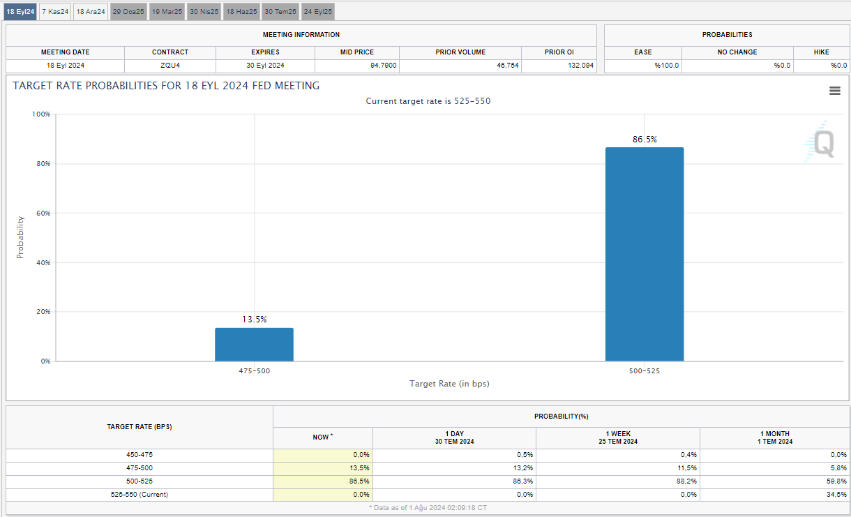 Altın fiyatları Fed'in faiz indirimi sinyalleri ve Başkan Powell'ın açıklamaları sonrasında geç saatlerde iki haftanın zirvesini test etti. ABD'de yakın zamanda para politikasının gevşetileceği yönünde beklentiler altın fiyatlarına da destek sağladı. Bu kapsamda son olarak ABD Merkez Bankası (Fed) politika faizini sabit tutmuş ancak eylül ayında bir faiz indirimine kapı aralamıştı. Fed Başkanı Jerome Powell ise merkez bankası yetkililerinin eylül toplantısında faizleri düşürme konusunu "ciddi şekilde ele aldıklarını" bildirmişti. Bu gelişmelerin ardından eylülde 25 baz puan faiz indiriminin gerçekleşmesine yüzde 86,5 ihtimal veren piyasalar, Fed'in 50 baz puan faiz indirimine gitmesine ise yüzde 13,5 olasılık vermeye başladı. Kaynak: CME Fedwatch Altın fiyatları ise Fed Başkanı Powell'ın eylülde faiz indirimine açık kapı bırakmasının ardından iki haftanın zirvesini test etti. Bu lokal zirvenin ardından ise altın fiyatlarında sınırlı bir geri çekilme yaşanıyor. Buna göre ons altın dün geç saatlerdeki yükselişinin ardından bu sabah yüzde 0,12 düşüşle 2 bin 444 dolar seviyesinden fiyatlanıyor. Değeri ons altın ve dolar/TL ile hesaplanan gram altın ise temmuz ayının sonunda 2 bin 500 liranın altına kadar geriledikten sonra Orta Doğu’da yaşanan gelişmeler ve Fed’den aldığı destekle erken saatlerde 2 bin 622 TL seviyesine kadar çıktı. Bu seviyenin ardından ise gram altın yüzde 0,16 geri çekilerek 2 bin 604 liradan işlem görüyor. Gram altın son olarak 17 Temmuz 2024 tarihinde 2 bin 642 lirayla tüm zamanların en yüksek seviyesine çıkmıştı. [news_id:741229]