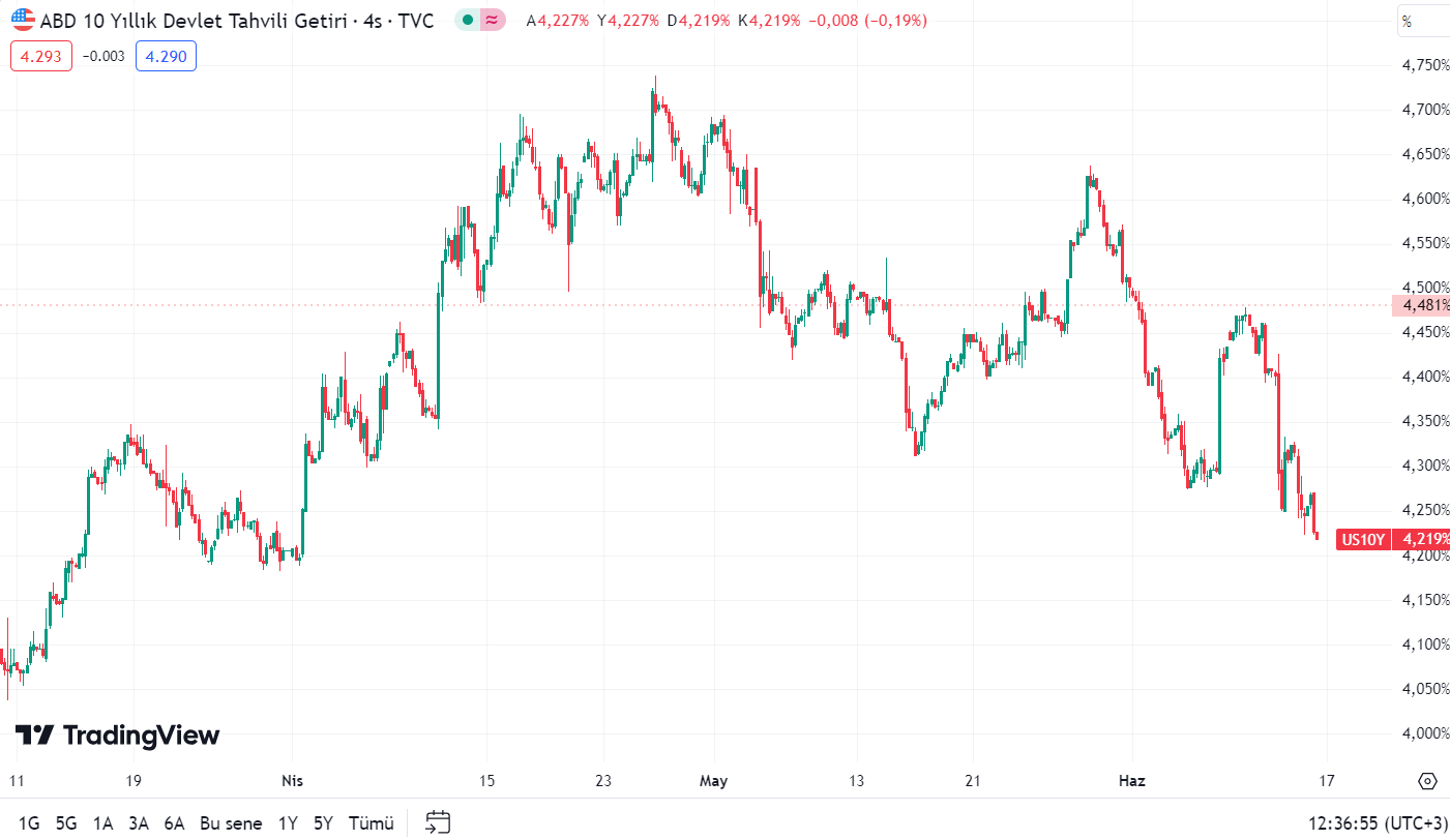 Kurban Bayramı tatili öncesinde haftanın son işlem gününde dolar/TL ve gram altında yükseliş hızlandı. Kurban Bayramı tatili öncesinde yurt içi piyasalarda haftanın son işlem gününde hareketlilik arttı. Buna göre dolar/TL yüzde 1,45 yükselirken, değeri ons altın ve dolar/TL ile hesaplanan gram altın yüzde 2’ye yakın yükseliş kaydetti. Yerel seçimlerin ardından 32 ila 32,60 bandında yatay seyreden dolar/TL'de son günlerde küresel yatırımcının günlük risk iştahını yansıtan sınırlı dalgalanmalar görülmeye başlanmıştı. Buna göre önce Avrupa'da gerçekleşen seçim sonuçları ardından ise ABD istihdam ve ABD enflasyon verileriyle TL'de yabancı günlük giriş çıkışını içeren hareketler hızlanmıştı. İşlemciler ise TL'nin gelişmekte olan ülke para birimlerine giriş çıkışlarını benzer şekilde yansıtmaya yeni başladığını belirterek, bunun da sağlıklı bir hareket olduğunu aktarmıştı. [news_id:736902] Altında son durum Altın fiyatları ise Fed'in bu yıl sadece bir faiz indirimi öngörmesine rağmen beklenenden daha zayıf gelen ABD üretici enflasyonu verilerinin ardından haftanın son işlem gününde yükselişine hız kazandırdı. ABD'de dün açıklanan üretici fiyat endeksi (ÜFE) verisi, mayıs ayında düşük enerji maliyetleri nedeniyle beklenmedik bir şekilde düşüş yaşandığını ve enflasyonun ilk çeyrekte yükseldikten sonra gerilemeye başladığını göstermişti. Bu da çarşamba günü faizi 23 yılın en yüksek seviyesinde sabit bırakan Fed’in yıl sonuna kadar sadece bir faiz indirimi beklendiğini aktarmasının ardından faiz indirimi sayısının ikiye çıkabileceği tahminlerini yeniden kuvvetlendirdi. Kitco Metals kıdemli analisti Jim Wyckoff ise konuyla ilgili paylaşımında, "Piyasa bu yıl muhtemelen birden fazla kesinti olacağını düşünüyor ve bu yüzden altın piyasasında daha güçlü bir satış baskısı görmüyorsunuz, bugün tahvil getirilerinin düştüğünü görmemizin nedeni de bu." dedi. Kaynak: Tradingview Gösterge ABD 10 yıllık Hazine tahvillerinin getirisi ise 25 Nisan’da yüzde 4,73 seviyesine kadar çıktıktan sonra bugün itibarıyla yüzde 4,21’e geriledi. Bu oran ise ABD 10 yıllık tahvillerinin 1 Nisan'dan bu yana en düşük seviyeye indiğini gösterdi. [news_id:736866]