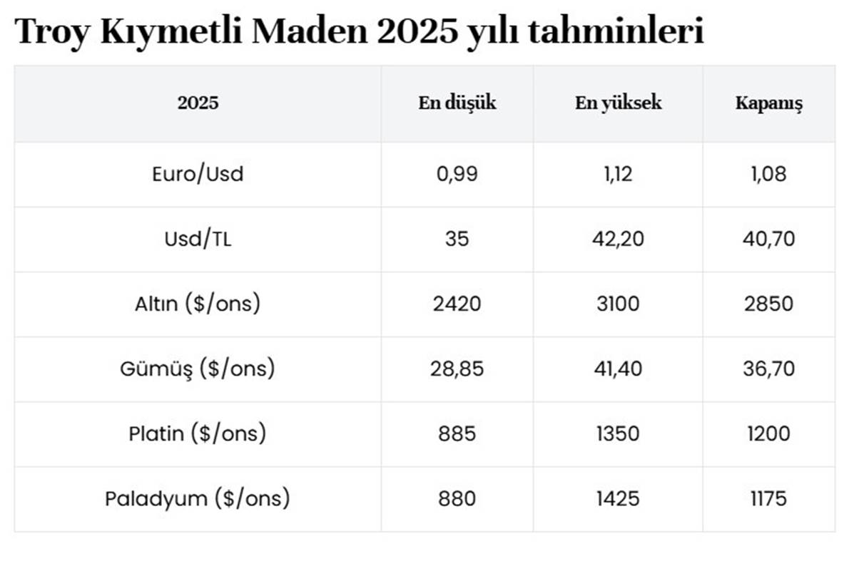 Troy Kıymetli Maden Ticareti, değerli metallerde bu yıla ilişkin tahminlerini açıkladı. Şirketin yayımladığı raporda, altın ve gümüş fiyatlarında bu yıl yeni rekorların gelebileceği bildirildi. İşte altın, gümüş, platin ve paladyumda 2025 beklentileri.. Kıymetli maden ticareti şirketlerinden Troy Kıymetli Maden Ticaret A.Ş., "Kıymetli Madenler 2025 Yılı Beklentileri" başlıklı raporunu yayımladı. Raporda, 2025 yılı boyunca kıymetli madenlerden altın, gümüş, platin ve paladyum için "boğa piyasası"nın hâkim olacağı vurgulandı. İlgili raporda, jeopolitik risklerin ve merkez bankalarının faiz indirimlerinin etkisiyle ons altın fiyatının 3.000 dolar seviyesini aşmasının beklendiği bildirildi. 2024 yılını yükseliş ivmesiyle tamamlayan gümüşün ise 2025 yılında da benzer bir performans sergileyebileceği öngörüldü. Bu kapsamda faiz indirimlerinin ve artan endüstriyel talebin etkisiyle gümüş fiyatlarının ons bazında 40 doları aşacağı tahmin edildi. Raporda, platin fiyatlarının yılı 1200 dolardan, paladyum fiyatlarının ise 1175 dolardan kapatacağı öngörüldü. [news_id:759435] 2025 yılına ilişkin tahminlerin yer aldığı raporda, döviz kurlarına yönelik öngörülere de yer verildi. Buna göre dolar/TL’nin yıl içinde 42 liranın üzerini test etmesinin beklendiği ve yılı 40,70 seviyesinde kapatabileceği tahmin edildi. Kaynak: Bloomberg HT [news_id:757701] [news_id:759836]