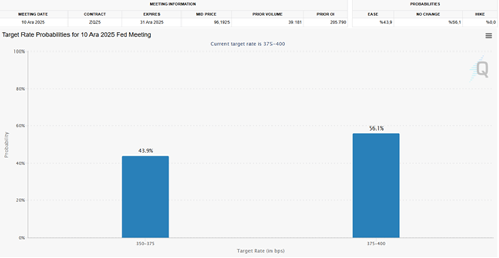 Altın fiyatları, Fed’e yönelik faiz indirimi beklentilerinin zayıflamasıyla yeni haftaya kayıpla başladı. Altın fiyatları geçtiğimiz hafta ABD’de 43 gün süren kapanmanın ardından açıklanacak ekonomik verilerin Fed’in faiz indirimi adımını güçlendireceği beklentisiyle haftalık bazda yüzde 5’e varan artış kaydetmişti. Ancak, ABD Çalışma Bakanı Chavez-Deremer, eylül ayı tarım dışı istihdam verilerinin henüz işlenemediğini, ekim ayı enflasyon rakamlarının da tam olarak toplanamadığını belirterek bu beklentilerin tersine dönmesine sebep oldu. Söz konusu verilerin açıklanıp açıklanmayacağı konusunda belirsizlik bulunduğunu aktaran Chavez-Deremer, verilerdeki gecikmeye ilişkin çözüm çalışmalarının sürdüğünü söyledi. Fed’in atacağı adıma ilişkin belirsizliği artıran veri çıkmazı ise piyasanın faiz indirimi beklentisinde daha temkinli kalmasına yol açtı. CME Group verilerine göre piyasalar, aralık ayında gerçekleşecek toplantıda faizlerin 25 baz puan indirimesine geçen haftaki yüzde 67 yerine yüzde 43 ihtimal vermeye başladı. Kaynak: CME Group [news_id:791891] Altın yeni haftaya kayıpla başladı Beklentilerdeki değişimin ardından altının onsu haftanın ilk işlem gününde yüzde 0,57 kayıpla 4 bin 63 dolara indi. Gram altın fiyatı da ons altına benzer şekilde yüzde 0,52 kayıpla 5 bin 523 liraya geriledi. Geçtiğimiz hafta ons altın 4245 dolara, gram altın ise 5 bin 767 liraya çıkarak üç haftanın en yüksek seviyesine ulaşmıştı. Fed yetkililerinden temkinli mesajlar gelmişti Fed yetkilileri ise geçtiğimiz hafta sözlü yönlendirmeleriyle politika gevşemesi beklentilerinin azalmasına katkıda bulunarak altın fiyatlarının düşüşünü desteklemişti. St. Louis Başkanı Alberto Musalem, ihtiyatlı olunması gerektiğini söylerken; Cleveland başkanı Beth Hammack, kısıtlayıcı politikanın enflasyonla mücadeleye yardımcı olacağını belirtmişti. Ekim ayındaki faiz indirimine karşı çıktığını söyleyen Minneapolis Başkanı Neel Kashkari de gelecek ayki toplantıda Fed’in temkinli kalmasını tavsiye etmişti. [news_id:791385]