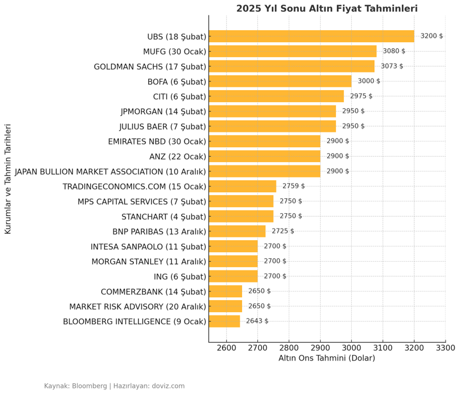 Ons altın ve gram altın, ABD Başkanı Donald Trump’ın gümrük tarifelerinin yarattığı belirsizliğin ortasında rekor tazeledi. Peki, yabancı kurumların 2025 sonuna ilişkin altın tahminleri ne yönde oldu? İşte 20 kurumdan 20 öngörü.. ABD Başkanı Donald Trump’ın ek gümrük tarifelerine ilişkin söylemleri sonrasında altın fiyatları rekor tazelemeye devam ediyor. Buna göre ons altın, bu sabah saat 11.09 itibarıyla 0,62 artışla 2 bin 953 dolar seviyesine çıktı. Değeri ons altın ve dolar/TL ile hesaplanan gram altın ise tüm zamanların zirvesini 3 bin 450 TL’ye çıkardı. Gözler Fed'in adımlarında olacak Altın fiyatlarındaki yükselişin ortasında yatırımcılar ise Trump'ın jeopolitik tansiyonu etkileyen söylemlerinin ardından Fed'in 18-19 Mart tarihlerinde yapılacak FOMC toplantısında açıklayacağı kararı bekleyecek. Piyasalar, Fed’in faizleri temmuz ayı toplantısına kadar sabit tutacağını tahmin ederken temmuz toplantısında 25 baz puanlık bir indirim yapılmasına yüzde 44,9 ihtimal veriliyor. Kaynak: CME Group 20 kurumdan 20 tahmin Jeopolitik gerilimlerle yükselen altın fiyatlarında yabancı kurumlar ise Fed'in daha temkinli bir tutum sergileyebileceği beklentisiyle yıl sonuna ilişkin daha ılımlı tahminlerde bulunuyor. Bu kapsamda ons altın için 2025 yıl sonuna ilişkin en düşük tahmin, 9 Ocak tarihli raporda Bloomberg Intelligence tarafından 2.643 dolar olarak açıklandı. En yüksek tahmin ise 18 Şubat tarihinde UBS tarafından yapıldı ve ons altının 2025 sonunda 3.200 dolar seviyesine ulaşacağı öngörüldü. 20 kurumun tahminlerinin ortalaması ise 2.848 dolar olarak hesaplandı. Kurumların tahminleri ve tahminlerini açıkladıkları tarihler ise şöyle listelendi: [news_id:763139]