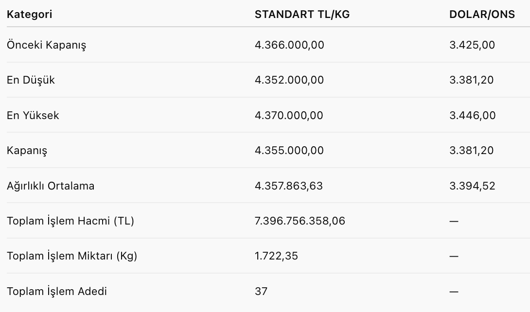Borsa İstanbul Kıymetli Madenler ve Kıymetli Taşlar Piyasası'nda (KMKTP) haftanın ilk işlem gününde standart altının kilogram fiyatı 4 milyon 355 bin liraya geriledi. Geçen hafta 4 milyon 366 bin lira seviyesinden kapanan altın, günlük bazda yüzde 0,25 oranında düşüş kaydetti. Altın piyasasında gün içinde en düşük 4 milyon 352 bin lira, en yüksek 4 milyon 370 bin lira seviyeleri görüldü. Standart altının kilogram fiyatı, işlem gününü 4 milyon 355 bin lira seviyesinde tamamladı. Aynı zaman diliminde dolar bazında en düşük 3.381,20 dolar, en yüksek 3.446,00 dolar seviyesi gözlemlendi. Kapanış fiyatı ise 3.381,20 dolar oldu. İşlem Hacmi ve Miktarı Borsa İstanbul Kıymetli Madenler ve Kıymetli Taşlar Piyasası'nda günlük toplam işlem hacmi 7 milyar 396 milyon 756 bin 358,06 lira olarak kayıtlara geçti. Bu hacim 1.722,35 kilogram altın işlemi ile gerçekleşti. Tüm metaller baz alındığında toplam işlem hacmi 7 milyar 396 milyon 802 bin 353,46 lira oldu. En Fazla İşlem Yapan Kurumlar Altın borsasında bugün en fazla işlem yapan kurumlar sırasıyla Yapı ve Kredi Bankası, Çakmakçı Kıymetli Madenler, Vakıf Katılım Bankası, Dünya Katılım Bankası ve Doruk Döviz ve Kıymetli Madenler olarak sıralandı.