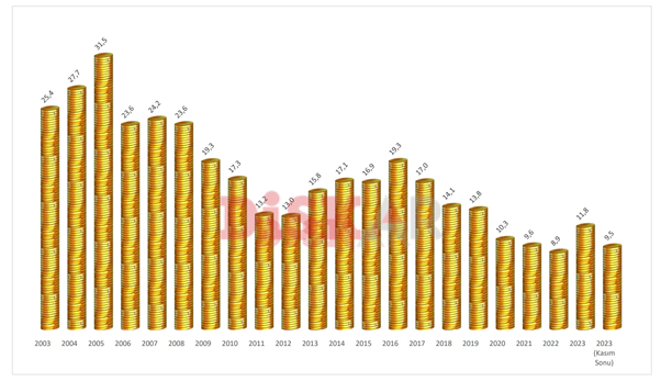 Asgari ücretle çalışan bir işçi 2003 yılında yıllık geliriyle 25,4 cumhuriyet altını alabilirken, 2023 yılında bu rakam 9,5’in altına geriledi. Asgari ücretin cumhuriyet altını karşısında en değerli olduğu yıl ise 31,5 ile 2005 yılıydı. DİSK Araştırma Merkezi (DİSK-AR) tarafından yapılan çalışmaya göre Türkiye Cumhuriyet Merkez Bankası'nın (TCMB) 20 Kasım tarihli ortalama cumhuriyet altını fiyatları baz alındığında, asgari ücret sadece döviz karşısında değil altın karşısında da önemli ölçüde değer kaybetti. TCMB verilerine göre 2003 yılında asgari ücretin yıllık tutarı ile 25 altın alınabilmekteydi. Cumhuriyet altın fiyatının 2005 yılında ortalama 133,38 liraya yükselmesine karşın asgari ücretlinin bir yıllık ücretinin 4 bin 200 liraya çıkması ise 31,5 cumhuriyet altını alınabileceğini gösteriyordu. Bu rakam aynı zamanda en yüksek alım gücünün olduğu yıla işaret ediyordu. Sonraki yıllarda ise asgari ücret, altın karşısında değer kaybını sürdürdü. Yıllık alım gücü olarak 24 ile 10 cumhuriyet altını arasında seyreden asgari ücret, en dramatik değer kaybını ise 2022 yılında yaşadı. Buna göre 2022 yılında asgari ücret Ocak ve Temmuz'da artırılmasına karşın asgari ücretlinin yıllık ortalama geliri ile alabildiği altın sayısı 8,9 oldu. Bu yıl ortalama fiyatlarla 11,8 altın alabilen asgari ücretli, kasım ayında ise 9,5 altın alabiliyor. Yıllara göre asgari ücret ve altın alım gücü ise şöyle listeleniyor: Kaynak: DİSK-AR / TCMB, Cumhuriyet altını fiyatları (yıllık ortalama). TCMB’den verilerin çekilme tarihi 20 Kasım 2023’tür. [news_id:718043] [news_id:717687]