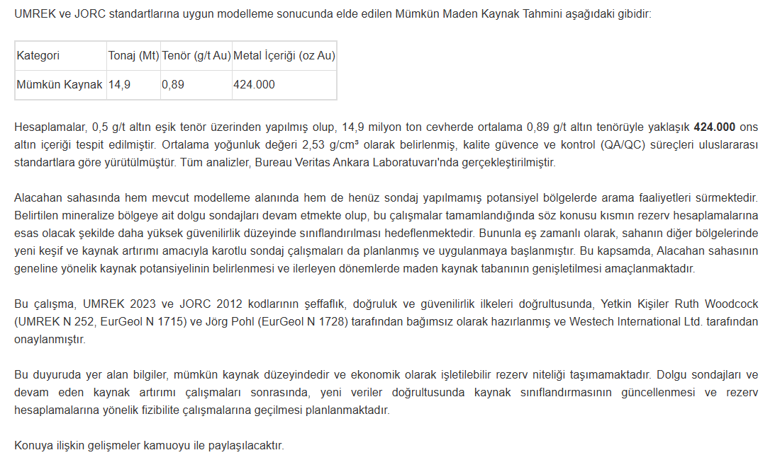 Ereğli Demir ve Çelik’ten Kamu Aydınlatma Platformu’na yapılan açıklamaya göre Sivas’ın Kangal ilçesinde yürütülen maden arama çalışmalarında 13,2 ton altın rezervi tespit edildi. İlgili açıklamanın ardından şirket hisseleri yeni güne yüzde 6’nın üzerinde kayıpla başladı. İşte detaylar.. Ereğli Demir ve Çelik Fabrikaları T.A.Ş., Sivas ili Kangal ilçesinde gerçekleştirdiği altın arama çalışmalarında yeni bir keşif yaptı. Şirket, Alacahan Köyü mevkiinde yürütülen faaliyetlerde, UMREK (Ulusal Maden Kaynak ve Rezerv Raporlama Komisyonu) ve JORC (Australasian Joint Ore Reserves Committee) standartlarına uygun olarak 424.000 ons altın rezervi tespit ettiğini açıkladı. Şirketten yapılan açıklamaya göre, 0,89 gram/ton altın tenörüyle yapılan hesaplamalar sonucunda 14,9 milyon tonluk cevherde yaklaşık 424.000 ons altın içeriği tespit edildi. “Ekonomik olarak işletilebilir rezerv niteliği taşımıyor” Ancak ilgili duyuruda keşfin, mümkün kaynak düzeyinde olduğu ve ekonomik olarak işletilebilir rezerv niteliği taşımadığının bildirilmesi, şirket hisselerinde keskin düşüşe yol açtı. Dünkü kapanışını 29,18 liradan yapan Ereğli Demir ve Çelik Fabrikaları’nın hisseleri duyurunun ardından yeni günde yüzde 7’ye yakın kayıp yaşadı. Eregli payları, bugün saat 10.44 itibarıyla yüzde 6,58 düşüşle 27,26 liradan işlem görüyor. Kaynak: KAP [news_id:724795]