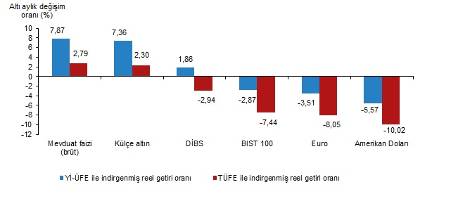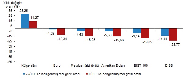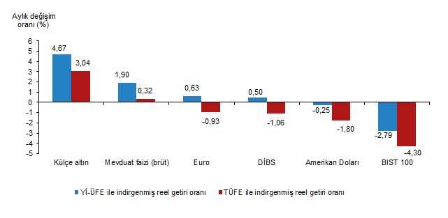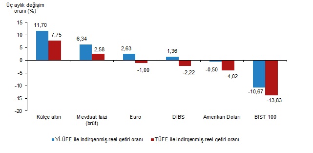 Türkiye İstatistik Kurumu (TÜİK), eylül ayında enflasyon ile indirgendiğinde en yüksek reel getirinin külçe altında olduğunu açıkladı. Türkiye İstatistik Kurumu (TÜİK), eylül ayına ilişkin finansal yatırım araçlarının reel getiri oranlarını açıkladı. Aylık en yüksek reel getiri, yurt içi üretici fiyat endeksi (Yİ-ÜFE) ile indirgendiğinde %4,67, tüketici fiyat endeksi (TÜFE) ile indirgendiğinde ise %3,04 oranlarıyla külçe altında gerçekleşti. Yİ-ÜFE ile indirgendiğinde; yatırım araçlarından mevduat faizi (brüt) %1,90, Euro %0,63 ve Devlet İç Borçlanma Senetleri (DİBS) %0,50 oranlarında yatırımcısına reel getiri sağlarken; Amerikan Doları %0,25 ve BIST 100 endeksi %2,79 oranlarında yatırımcısına kaybettirdi. TÜFE ile indirgendiğinde ise; mevduat faizi (brüt) %0,32 oranında yatırımcısına reel getiri sağlarken; Euro %0,93, DİBS %1,06, Amerikan Doları %1,80, ve BIST 100 endeksi %4,30 oranlarında yatırımcısına kaybettirdi. Kaynak: TÜİK Külçe altın, üç aylık değerlendirmede; Yİ-ÜFE ile indirgendiğinde %11,70, TÜFE ile indirgendiğinde ise %7,75 oranlarında yatırımcısına en yüksek reel getiri sağlayan yatırım aracı oldu. Aynı dönemde BIST 100 endeksi, Yİ-ÜFE ile indirgendiğinde %10,67, TÜFE ile indirgendiğinde ise %13,83 oranlarında yatırımcısına en çok kaybettiren yatırım aracı oldu. Kaynak: TÜİK Altı aylık değerlendirmeye göre mevduat faizi (brüt); Yİ-ÜFE ile indirgendiğinde %7,87, TÜFE ile indirgendiğinde ise %2,79 oranlarında yatırımcısına en yüksek reel getiri sağlayan yatırım aracı olurken; aynı dönemde Amerikan Doları, Yİ-ÜFE ile indirgendiğinde %5,57, TÜFE ile indirgendiğinde ise %10,02 oranlarında yatırımcısına en çok kaybettiren yatırım aracı oldu. Kaynak: TÜİK Finansal yatırım araçları yıllık olarak değerlendirildiğinde külçe altın; Yİ-ÜFE ile indirgendiğinde %28,25, TÜFE ile indirgendiğinde ise %14,27 oranlarında yatırımcısına en yüksek reel getiri sağlayan yatırım aracı oldu. Yıllık değerlendirmede, Yİ-ÜFE ile indirgendiğinde; yatırım araçlarından, Euro %1,62, mevduat faizi (brüt) %4,63, Amerikan Doları %5,36, BIST 100 endeksi %9,14 ve DİBS %14,44 oranlarında yatırımcısına kaybettirdi. TÜFE ile indirgendiğinde Euro %12,34, mevduat faizi (brüt) %15,03, Amerikan Doları %15,68, BIST 100 endeksi %19,05 ve DİBS %23,77 oranlarında yatırımcısına kaybettirdi. Kaynak: TÜİK [news_id:748171] [news_id:747790] [news_id:748332] [news_id:747966]