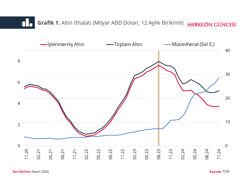 Merkez Bankası ekonomistleri, kota nedeniyle altın ithalatı kompozisyonunda yaşanan değişimin tüketim talebi göstergelerine etkisini inceledi. TCMB Genel Müdür Yardımcısı Altan Aldan, Kıdemli Ekonomist Okan Eren, Yardımcı Ekonomist Barbaros Eriş ve Uzman Yardımcısı Didem Yazıcı tarafından kaleme alınan "Altın İthalat Kotası ve Tüketim Talebi Göstergeleri" blog yazısı, Merkezin Güncesi sayfasında yayımlandı. İlgili analize göre altında kota uygulaması altın ithalatı kompozisyonunda önemli bir değişime neden oldu. Bu kapsamda analizde, "7 Ağustos 2023 tarihinden itibaren geçerli olan kota uygulaması ile işlenmemiş altın ithalatı hızlı bir şekilde geriledi. Ağustos 2023'te 12 aylık birikimli olarak 34 milyar dolar seviyesinde olan işlenmemiş altın ithalatı, 2024 yılı kasım ayı itibarıyla yarı yarıya azalarak 17 milyar doların altına kadar geriledi" denildi. Yazıda ayrıca şu görüşlere yer verildi: Son yıllarda, pandemi ve jeopolitik riskler gibi nedenlerle altına olan küresel talepte ve altın ons fiyatında artış yaşanmakta. Bu ortamda, hanehalkının geleneksel olarak altın tutma eğiliminin yüksek olduğu Türkiye’de işlenmemiş altın ithalatında önemli artışlar oldu. Öte yandan, 7 Ağustos 2023 tarihinden itibaren geçerli olan kota uygulaması ile işlenmemiş altın ithalatı hızlı bir şekilde geriledi. Ağustos 2023’te 12 aylık birikimli olarak 34 milyar dolar seviyesinde olan işlenmemiş altın ithalatı, 2024 yılı kasım ayı itibarıyla yarı yarıya azalarak 17 milyar doların altına kadar geriledi. Diğer taraftan, tüketim malları içinde sınıflandırılan mücevherat ithalatında kota sonrası dönemde hızlı bir artış olduğu dikkat çekiyor. 12 aylık mücevherat ithalatı, kota uygulamasının başladığı 2023 yılı ağustos ayında 1,6 milyar dolar civarındayken, geçen yılın kasım ayı itibarıyla yaklaşık 4 kat artarak 6,4 milyar doları aştı. İşlenmemiş altın ve mücevherat ithalatının toplamı ise, aynı dönemde 35,5 milyar dolardan 23 milyar dolar seviyesine geriledi. Diğer bir deyişle, toplam altın ithalatında kota uygulaması sonrasında gerileme gözlenirken kompozisyonunda da belirgin bir değişiklik yaşandı. Kota uygulaması sonrasında yaşanan bu değişim, tüketim malı ithalatı gelişmelerini değerlendirirken temkinli olmayı gerektiriyor. Nitekim tüketim malı ithalatı 2024 yılının ocak-kasım döneminde bir önceki yılın aynı dönemine kıyasla yüzde 13,1 artarken bu artışın 9,2 yüzde puanlık kısmı mücevherat ürünlerinden kaynaklandı. Bir başka ifadeyle, diğer ürünlerin tüketim malı ithalatı artışına katkısı sadece 3,9 yüzde puan seviyesinde gerçekleşti. Dolayısıyla tüketim malı ithalatında gözlenen artışın genele yayılmış bir durum olmadığı görülüyor. Mücevherat ithalatında son dönemde gözlenen hareketler özellikle bazı aylarda tüketim malı ithalatında yüksek artışlara ve oynaklığa neden oluyor. Bu durum, tüketim malı ithalatının bir talep göstergesi olarak değerlendirilmesini oldukça zorlaştırıyor. Örneğin, 2024 yılının nisan ayında tüketim malları ithalatı yüzde 17 gibi yüksek bir oranda artarken mücevherat ürünleri dışlandığında yüzde 2 civarında bir gerileme olduğu görülüyor. Benzer şekilde, tüketim malı ithalatı 2024 yılının ikinci yarısında ciddi bir canlanmaya işaret ederken mücevherat ürünleri dışlanarak bakıldığında yataya yakın bir görünüm sergiliyor. İki gösterge arasındaki ayrışma 12 aylık birikimli verilerde daha belirgin hale geliyor. Yıllık tüketim malı ithalatı 2024 yılında artış kaydederken mücevherat hariç tüketim malı ithalatı yataya yakın bir patika izledi. Bu gözlemler, özellikle veriler aylık bazda yorumlanırken mücevherat etkisinin dikkate alınmasının önemini gösteriyor. Dış ticaret verilerinde son dönemde gözlenen bu farklılaşmaya benzer bir durum perakende satış hacim endekslerinde de yaşanıyor. Cirosunun büyük çoğunluğu altın ve altın ürünleri satışlarından oluşan “saat ve mücevher perakende ticareti” alt sektöründeki gelişmeler perakende satış hacim endeksinin seyrini etkiliyor. Tüketim talebi eğilimini daha sağlıklı incelemek amacıyla toplam perakende sektörü satış hacminden “saat ve mücevher perakende ticareti” sektörü dışlanarak “altın hariç perakende satış hacim endeksi” oluşturuluyor. Bu endeks, 2023 yılının haziran ayından itibaren belirgin bir şekilde perakende sektörü satış hacim endeksinin altında, 2024 yılı temmuz ayından itibaren de yatay bir seyir izliyor. Özetle, altında kota uygulaması altın ithalatı kompozisyonunda önemli bir değişime neden oldu. Ara malı kapsamındaki işlenmemiş altın ithalatı kota nedeniyle gerilerken tüketim mallarına dâhil olan mücevherat ithalatı tarihsel ortalamanın oldukça üzerine çıktı. Mücevherat talebinde yaşanan değişimlerin etkisi aynı zamanda perakende satış hacim endeksinde de gözleniyor. Dolayısıyla, tüketim talebine ilişkin göstergelerin sağlıklı bir şekilde yorumlanabilmesi için bu gelişmelerin dikkate alınması önem arz ediyor."