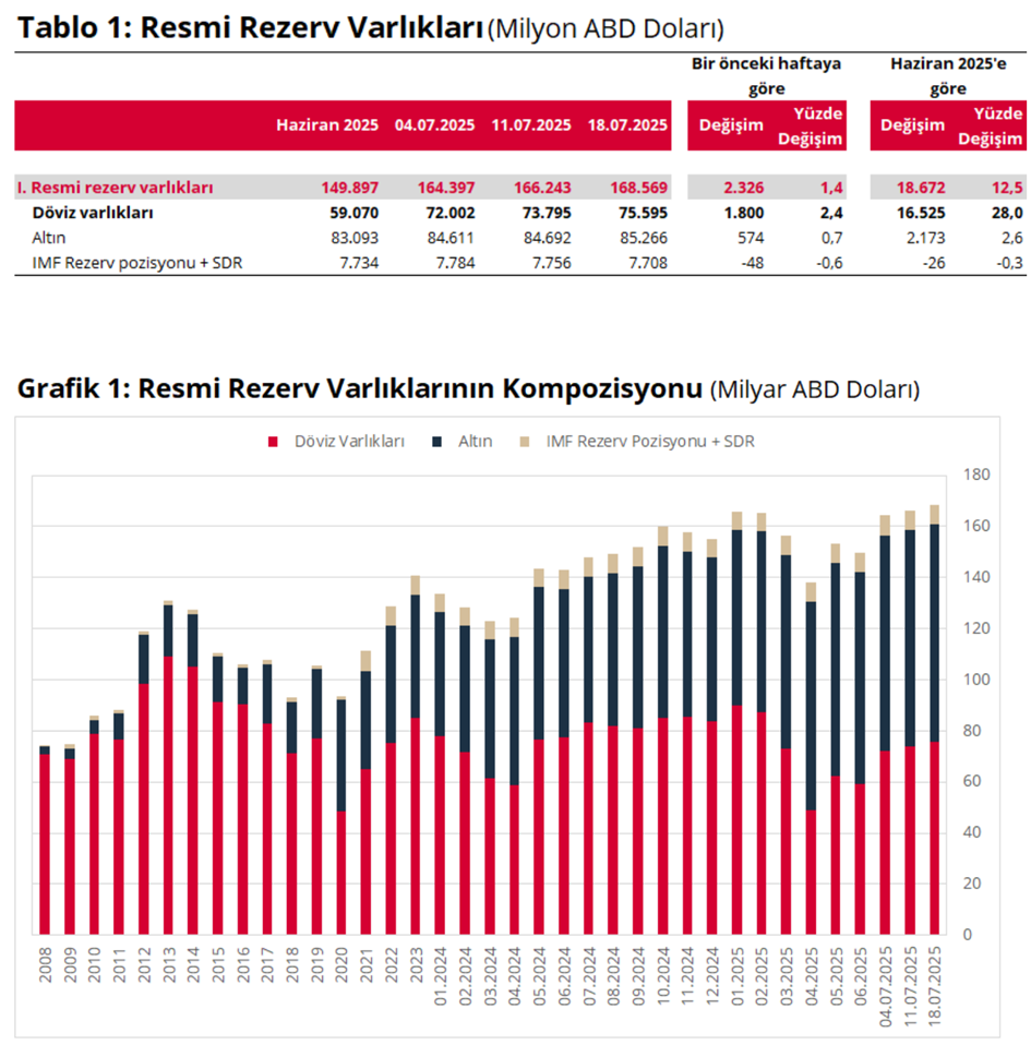 Türkiye Cumhuriyet Merkez Bankası'nın rezervleri 18 Temmuz itibarıyla %1,4 artarak 168,6 milyar dolara yükseldi. Türkiye Cumhuriyet Merkez Bankası’nın (TCMB) Uluslararası Rezervler ve Döviz Likiditesi verileri yayımlandı. TCMB haftalık verilerine göre 18 Temmuz itibarıyla toplam rezervler yüzde 1,4 artışla 168,6 milyar dolara yükseldi. İlgili dönemde döviz varlıkları bir önceki haftaya göre %2,4 artarak 75,6 milyar dolar, altın cinsinden rezerv varlıkları %0,7 artarak 85,3 milyar dolar, IMF rezerv pozisyonu ve SDR toplamı ise %0,6 azalarak 7,7 milyar dolar oldu. [news_id:779432] [news_id:779099]