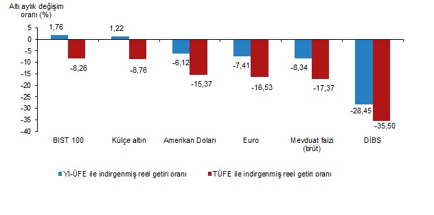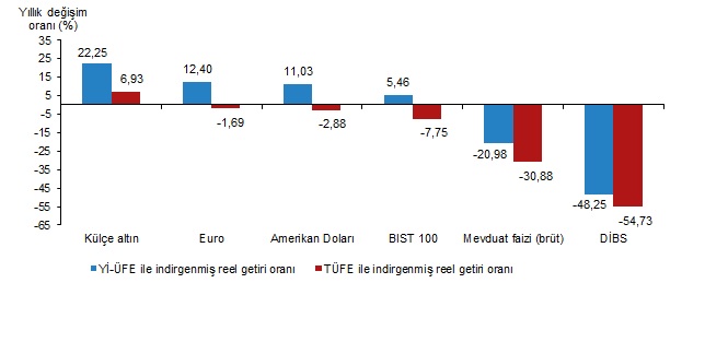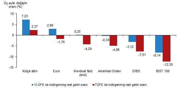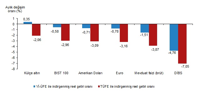 TÜİK verilerine göre ocak ayında aylık ve yıllık bazda en yüksek reel getiri altında oldu. Türkiye İstatistik Kurumu (TÜİK) tarafından yapılan açıklamaya göre, aylık en yüksek reel getiri, yurt içi üretici fiyat endeksi (Yİ-ÜFE) ile indirgendiğinde %0,35 oranında külçe altında gerçekleşti. Tüketici fiyat endeksi (TÜFE) ile indirgendiğinde ise külçe altın %2,06 oranında yatırımcısına kaybettirdi. Yİ-ÜFE ile indirgendiğinde; yatırım araçlarından BIST 100 endeksi %0,58, Amerikan Doları %0,71, Euro %0,78, mevduat faizi (brüt) %1,51 ve Devlet İç Borçlanma Senetleri (DİBS) %4,76 oranlarında yatırımcısına kaybettirdi. TÜFE ile indirgendiğinde; BIST 100 endeksi %2,96, Amerikan Doları %3,09, Euro %3,16, mevduat faizi (brüt) %3,87 ve DİBS %7,05 oranlarında yatırımcısına kaybettirdi. Finansal yatırım araçlarının aylık reel getiri oranları, Ocak 2024 Kaynak: TÜİK Külçe altın, üç aylık değerlendirmede; Yİ-ÜFE ile indirgendiğinde %7,23, TÜFE ile indirgendiğinde ise %2,37 oranlarında yatırımcısına en yüksek reel getiri sağlayan yatırım aracı oldu. Aynı dönemde BIST 100 endeksi, Yİ-ÜFE ile indirgendiğinde %8,14, TÜFE ile indirgendiğinde ise %12,30 oranlarında yatırımcısına en çok kaybettiren yatırım aracı oldu. Finansal yatırım araçlarının üç aylık reel getiri oranları, Ocak 2024 Kaynak: TÜİK Altı aylık değerlendirmeye göre BIST 100 endeksi; Yİ-ÜFE ile indirgendiğinde %1,76 oranında yatırımcısına en yüksek reel getiri sağlarken; TÜFE ile indirgendiğinde ise %8,26 oranında yatırımcısına kaybettirmiştir. Aynı dönemde DİBS, Yİ-ÜFE ile indirgendiğinde %28,45, TÜFE ile indirgendiğinde ise %35,50 oranlarında yatırımcısına en çok kaybettiren yatırım aracı oldu. Finansal yatırım araçlarının altı aylık reel getiri oranları, Ocak 2024 Kaynak: TÜİK Yıllık değerlendirmede en yüksek reel getiri külçe altında gerçekleşti Finansal yatırım araçları yıllık olarak değerlendirildiğinde külçe altın; Yİ-ÜFE ile indirgendiğinde %22,25, TÜFE ile indirgendiğinde ise %6,93 oranlarında yatırımcısına en yüksek reel getiri sağlayan yatırım aracı oldu. Yıllık değerlendirmede, Yİ-ÜFE ile indirgendiğinde; yatırım araçlarından, Euro %12,40, Amerikan Doları %11,03 ve BIST 100 endeksi %5,46 oranlarında yatırımcısına reel getiri sağlarken; mevduat faizi (brüt) %20,98 ve DİBS %48,25 oranlarında yatırımcısına kaybettirdi. TÜFE ile indirgendiğinde Euro %1,69, Amerikan Doları %2,88, BIST 100 endeksi %7,75, mevduat faizi (brüt) %30,88 ve DİBS %54,73 oranlarında yatırımcısına kaybettirdi. Finansal yatırım araçlarının yıllık reel getiri oranları, Ocak 2024 Kaynak: TÜİK Bu konu ile ilgili bir sonraki haber bülteninin yayımlanma tarihi 8 Mart 2024'tür.