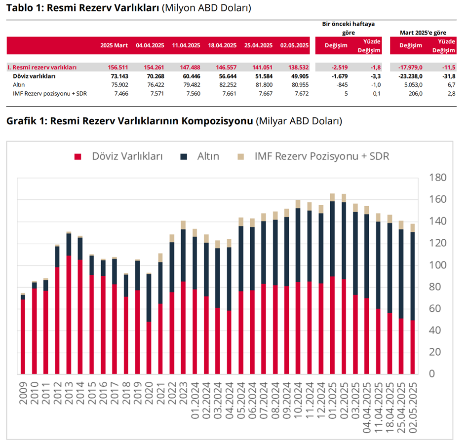 Türkiye Cumhuriyet Merkez Bankası (TCMB) toplam rezervleri geçtiğimiz hafta yüzde 1,8 düşüşle 138,5 milyar dolara geriledi. TCMB tarafından "Uluslararası Rezervler ve Döviz Likiditesi Gelişmeleri" verileri yayımlandı. İlgili verilere göre resmi rezerv varlıkları, bir önceki haftaya kıyasla %1,8 azalarak 138,5 milyar dolar düzeyine geriledi. Bu dönemde döviz varlıkları, bir önceki haftaya göre %3,3 azalarak 49,9 milyar dolar, altın cinsinden rezerv varlıkları %1,0 azalarak 80,9 milyar dolar, IMF rezerv pozisyonu ve SDR toplamı ise %0,1 artarak 7,7 milyar dolar oldu. Kaynak: TCMB