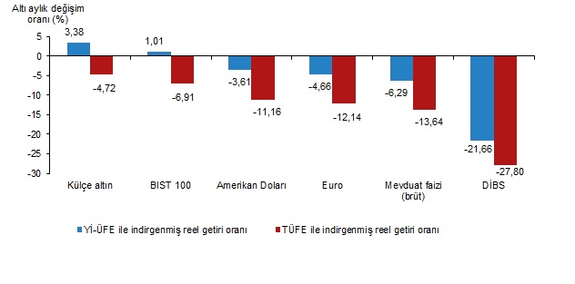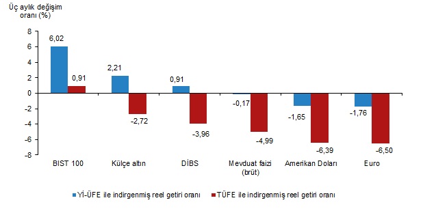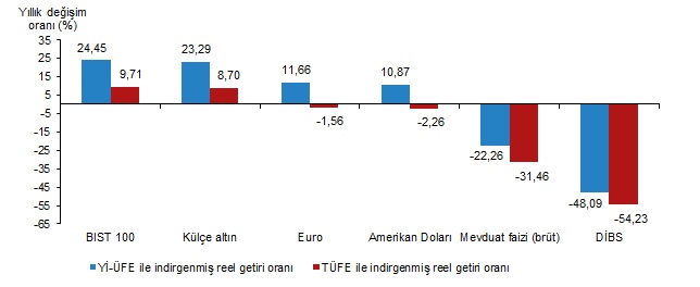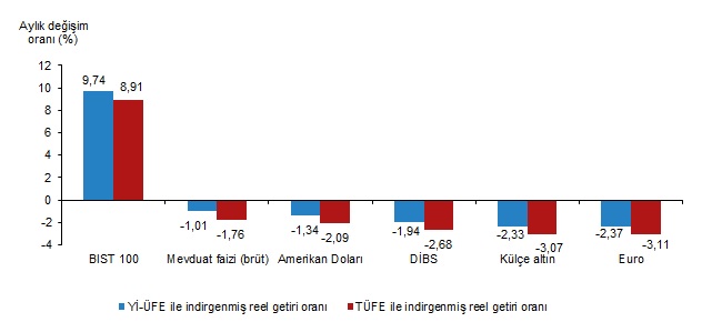 TÜİK verilerine göre şubat ayında aylık en yüksek reel getiri, yüzde 8,91 oranıyla Borsa İstanbul 100 endeksinde oldu. Türkiye İstatistik Kurumu (TÜİK) tarafından yapılan açıklamaya göre, Aylık en yüksek reel getiri, yurt içi üretici fiyat endeksi (Yİ-ÜFE) ile indirgendiğinde yüzde 9,74, tüketici fiyat endeksi (TÜFE) ile indirgendiğinde ise yüzde 8,91 oranlarıyla BIST 100 endeksinde gerçekleşti. Yİ-ÜFE ile indirgendiğinde; yatırım araçlarından mevduat faizi (brüt) yüzde 1,01, Amerikan Doları yüzde 1,34, Devlet İç Borçlanma Senetleri (DİBS) yüzde 1,94, külçe altın yüzde 2,33 ve Euro yüzde 2,37 oranlarında yatırımcısına kaybettirdi. TÜFE ile indirgendiğinde; mevduat faizi (brüt) yüzde 1,76, Amerikan Doları yüzde 2,09, DİBS yüzde 2,68, külçe altın yüzde 3,07 ve Euro yüzde 3,11 oranlarında yatırımcısına kaybettirdi. Kaynak: TÜİK BIST 100 endeksi, üç aylık değerlendirmede; Yİ-ÜFE ile indirgendiğinde yüzde 6,02, TÜFE ile indirgendiğinde ise yüzde 0,91 oranlarında yatırımcısına en yüksek reel getiri sağlayan yatırım aracı oldu. Aynı dönemde Euro, Yİ-ÜFE ile indirgendiğinde yüzde 1,76, TÜFE ile indirgendiğinde ise yüzde 6,50 oranlarında yatırımcısına en çok kaybettiren yatırım aracı oldu. Kaynak: TÜİK 6 aylık değerlendirmede lider külçe altın oldu Altı aylık değerlendirmeye göre külçe altın; Yİ-ÜFE ile indirgendiğinde yüzde 3,38 oranında yatırımcısına en yüksek reel getiri sağlarken; TÜFE ile indirgendiğinde ise yüzde 4,72 oranında yatırımcısına kaybettirmiştir. Aynı dönemde DİBS, Yİ-ÜFE ile indirgendiğinde yüzde 21,66, TÜFE ile indirgendiğinde ise yüzde 27,80 oranlarında yatırımcısına en çok kaybettiren yatırım aracı oldu. Kaynak: TÜİK Yıllık en yüksek reel getiri BIST 100 endeksinde Finansal yatırım araçları yıllık olarak değerlendirildiğinde BIST 100 endeksi; Yİ-ÜFE ile indirgendiğinde yüzde 24,45, TÜFE ile indirgendiğinde ise yüzde 9,71 oranlarında yatırımcısına en yüksek reel getiri sağlayan yatırım aracı oldu. Yıllık değerlendirmede, Yİ-ÜFE ile indirgendiğinde; yatırım araçlarından külçe altın yüzde 23,29, Euro yüzde 11,66 ve Amerikan Doları yüzde 10,87 oranlarında yatırımcısına reel getiri sağlarken; mevduat faizi (brüt) yüzde 22,26 ve DİBS yüzde 48,09 oranlarında yatırımcısına kaybettirdi. TÜFE ile indirgendiğinde külçe altın yüzde 8,70 oranında yatırımcısına reel getiri sağlarken; Euro yüzde 1,56, Amerikan Doları yüzde 2,26, mevduat faizi (brüt) yüzde 31,46 ve DİBS yüzde 54,23 oranlarında yatırımcısına kaybettirdi. Kaynak: TÜİK