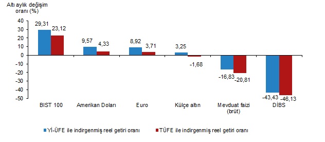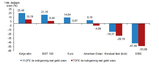TÜİK verilerine göre enflasyonla indirgendiğinde kasımda en yüksek aylık reel getiri külçe altında gerçekleşti. İşte yatırım araçlarının enflasyon karşısındaki performansı... Türkiye İstatistik Kurumu (TÜİK), kasım ayına ilişkin finansal yatırım araçlarının reel getiri oranlarını açıkladı. Buna göre, kasımda en yüksek reel getiri, TÜFE ile indirgendiğinde yüzde 2 ile külçe altında oldu. Yurt İçi Üretici Fiyat Endeksi (Yİ-ÜFE) ile indirgendiğinde de külçe altın yatırımcısına yüzde 2,47 kazanç sağladı. Yİ-ÜFE ile indirgendiğinde, yatırım araçlarından euro yüzde 2,27 yatırımcısına reel getiri imkanı sağlarken dolar yüzde 0,02 ve mevduat faizi (brüt) yüzde 0,54, BIST 100 endeksi yüzde 4,9 ve Devlet İç Borçlanma Senetleri (DİBS) yüzde 5,85 kaybettirdi. TÜFE ile indirgendiğinde, euro yüzde 1,8 reel getiri sağlarken dolar yüzde 0,47, mevduat faizi (brüt) yüzde 1, BIST 100 endeksi yüzde 5,34 ve DİBS yüzde 6,27 oranında yatırımcısını kayba uğrattı. Kaynak: TÜİK Finansal yatırım araçlarının üç aylık reel getiri oranları, Kasım 2023 Külçe altın, üç aylık değerlendirmede, Yİ-ÜFE ile indirgendiğinde yüzde 1,14 ile yatırımcısına en yüksek reel getiri sağlarken , TÜFE ile indirgendiğinde yüzde 2,06 ile yatırımcısına kaybettirdi. Aynı dönemde DİBS, Yİ-ÜFE ile indirgendiğinde yüzde 22,36, TÜFE ile indirgendiğinde yüzde 24,82 ile en çok kaybettiren yatırım aracı oldu. Kaynak: TÜİK Finansal yatırım araçlarının altı aylık reel getiri oranları, Kasım 2023 Altı aylık değerlendirmeye göre BIST 100 endeksi, Yİ-ÜFE ile indirgendiğinde yüzde 29,31, TÜFE ile indirgendiğinde yüzde 23,12 ile en yüksek reel getiri oluşturan yatırım aracı oldu. Aynı dönemde DİBS, Yİ-ÜFE ile indirgendiğinde yüzde 43,43, TÜFE ile indirgendiğinde yüzde 46,13 ile en çok kaybettiren yatırım aracı olarak kayıtlara geçti. Kaynak: TÜİK Finansal yatırım araçlarının yıllık reel getiri oranları, Kasım 2023 Finansal yatırım araçları yıllık olarak değerlendirildiğinde, külçe altın, Yİ-ÜFE ile indirgendiğinde yüzde 25,48, TÜFE ile indirgendiğinde yüzde 10,19 ile en yüksek reel getiri sağlayan yatırım aracı oldu. Yıllık değerlendirmede, Yİ-ÜFE ile indirgendiğinde, yatırım araçlarından BIST 100 endeksi yüzde 21,16, euro yüzde 14,64 ve dolar yüzde 8,18 reel getiri sağlarken mevduat faizi (brüt) yüzde 19,37 ve DİBS yüzde 47,49 kaybettirdi. TÜFE ile indirgendiğinde BIST 100 endeksi yüzde 6,4, euro yüzde 0,67 reel getiri imkanı sağlarken, dolar yüzde 4,99, mevduat faizi (brüt) yüzde 29,19 ve DİBS yüzde 53,88 kayba yol açtı. Kaynak: TÜİK [news_id:716364]