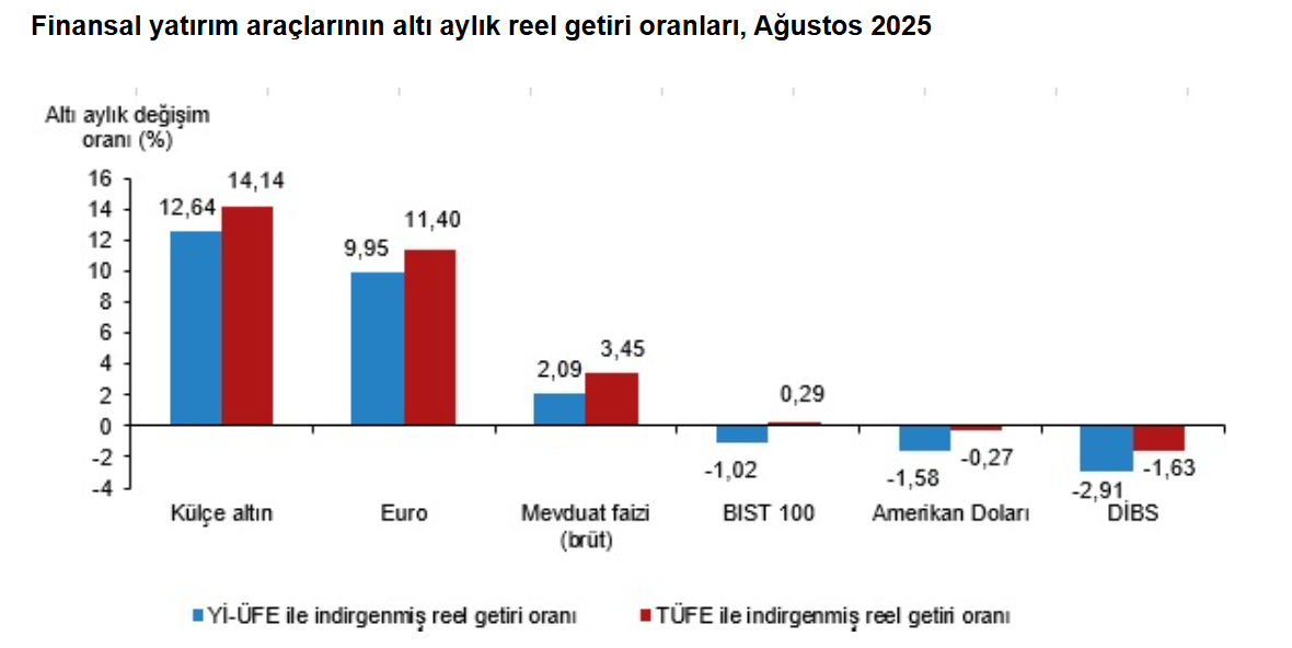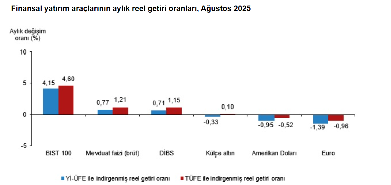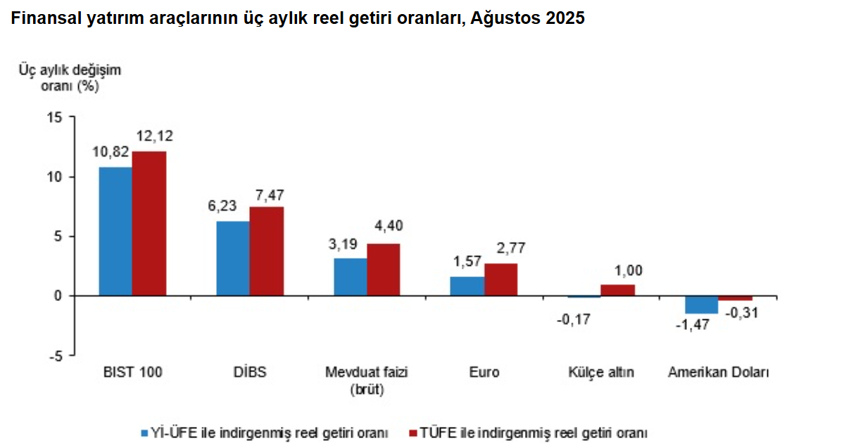 Türkiye İstatistik Kurumu (TÜİK), ağustos ayında enflasyon ile indirgendiğinde en yüksek reel getirinin BIST 100 endeksinde gerçekleştiğini açıkladı. Türkiye İstatistik Kurumu, ağustos ayına ilişkin finansal yatırım araçlarının reel getiri oranlarını açıkladı. Aylık en yüksek reel getiri, yurt içi üretici fiyat endeksi (Yİ-ÜFE) ile indirgendiğinde %4,15, tüketici fiyat endeksi (TÜFE) ile indirgendiğinde ise %4,60 oranlarıyla BIST 100 endeksinde gerçekleşti. Yİ-ÜFE ile indirgendiğinde; yatırım araçlarından, mevduat faizi (brüt) %0,77 ve Devlet İç Borçlanma Senetleri (DİBS) %0,71 oranlarında yatırımcısına reel getiri sağlarken; külçe altın %0,33, Amerikan Doları %0,95 ve Euro %1,39 oranlarında yatırımcısına kaybettirdi. TÜFE ile indirgendiğinde ise mevduat faizi (brüt) %1,21, DİBS %1,15 ve külçe altın %0,10 oranlarında yatırımcısına reel getiri sağlarken; Amerikan Doları %0,52 ve Euro %0,96 oranlarında yatırımcısına kaybettirdi. BIST 100 endeksi, üç aylık değerlendirmede; Yİ-ÜFE ile indirgendiğinde %10,82, TÜFE ile indirgendiğinde ise %12,12 oranlarında yatırımcısına en yüksek reel getiri sağlayan yatırım aracı oldu. Aynı dönemde Amerikan Doları; Yİ-ÜFE ile indirgendiğinde %1,47, TÜFE ile indirgendiğinde ise %0,31 oranlarında yatırımcısına en çok kaybettiren yatırım aracı oldu. Altı aylık değerlendirmeye göre külçe altın; Yİ-ÜFE ile indirgendiğinde %12,64, TÜFE ile indirgendiğinde ise %14,14 oranlarında yatırımcısına en yüksek reel getiri sağlayan yatırım aracı olurken; aynı dönemde DİBS, Yİ-ÜFE ile indirgendiğinde %2,91, TÜFE ile indirgendiğinde ise %1,63 oranlarında yatırımcısına en çok kaybettiren yatırım aracı oldu. Yıllık değerlendirmede en yüksek reel getiri külçe altında gerçekleşti Finansal yatırım araçları yıllık olarak değerlendirildiğinde külçe altın; Yİ-ÜFE ile indirgendiğinde %30,44, TÜFE ile indirgendiğinde ise %22,80 oranlarında yatırımcısına en yüksek reel getiri sağlayan yatırım aracı oldu. Yıllık değerlendirmede, Yİ-ÜFE ile indirgendiğinde; yatırım araçlarından mevduat faizi (brüt) %14,65, DİBS %3,70, Euro %2,36 oranlarında yatırımcısına reel getiri sağlarken; Amerikan Doları %3,11 ve BIST 100 endeksi %11,02 oranlarında yatırımcısına kaybettirdi. TÜFE ile indirgendiğinde ise mevduat faizi (brüt) %7,94 oranında yatırımcısına reel getiri sağlarken; DİBS %2,38, Euro %3,63, Amerikan Doları %8,79 ve BIST 100 endeksi %16,23 oranlarında yatırımcısına kaybettirdi.