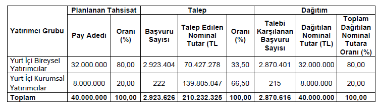Alves Kablo'nun 22-23 Şubat'ta düzenlenen halka arzına ilişkin sonuçlar açıklandı. İnfo Yatırım'dan Kamuyu Aydınlatma Platformu'na yapılan açıklamaya göre, Alves Kablo’nun sermayesinin 120 milyon TL’den 160 milyon TL’ye çıkarılması nedeniyle artırılan 40 milyon TL nominal değerli 40 milyon adet pay halka arz edildi. Alves Kablo paylarının mevcut halka arzında 1,00 TL nominal değerli payların halka arz fiyatı 19,45 TL olarak açıklanırken, belirlenen halka arz fiyatı ile halka arz büyüklüğü 778 milyon TL olarak gerçekleşti. Açıklamaya göre yurt içi bireysel yatırımcılar tahsisat tutarının yaklaşık 2,2 katı, yurt içi kurumsal yatırımcılar tahsisat tutarının yaklaşık 17,5 katı olmak üzere toplamda 5,3 kat filtrelenmemiş talep geldi. Açıklanan verilere göre ALVES halka arzında 2 milyon 870 bin 401 bireysel yatırımcıya azami 12 lot hisse dağıtımı yapıldı. Kaynak: KAP Öte yandan Sermaye Piyasası Kurulu’nun 2024 yılının 12. bülteninde onayladığı halka arzlarda talep toplama da bu hafta gerçekleştirilecek. Buna göre Mogan Enerji Yatırım Holding pay başına 11,33 liradan 28 Şubat – 1 Mart tarihlerinde, Artemis Halı ise pay başına 25,35 liradan 27 – 28 Şubat tarihlerinde talep toplayacak. Talep toplaması gerçekleşecek halka arzlarla ilgili daha fazla bilgi sahibi olabilmek için Halka Arz sekmemizi inceleyebilirsiniz. [news_id:725428]