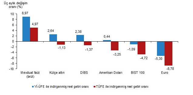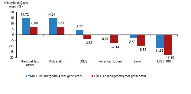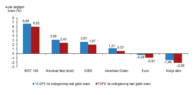 Türkiye İstatistik Kurumu (TÜİK), aralık ayında enflasyon ile indirgendiğinde en yüksek reel getirinin BIST 100 endeksinde gerçekleştiğini açıkladı. Türkiye İstatistik Kurumu (TÜİK), aralık ayına ilişkin finansal yatırım araçlarının reel getiri oranlarını açıkladı. Aylık en yüksek reel getiri, yurt içi üretici fiyat endeksi (Yİ-ÜFE) ile indirgendiğinde %6,68, tüketici fiyat endeksi (TÜFE) ile indirgendiğinde ise %6,02 oranlarıyla BIST 100 endeksinde gerçekleşti. Yİ-ÜFE ile indirgendiğinde; yatırım araçlarından mevduat faizi (brüt) %3,08, Devlet İç Borçlanma Senetleri (DİBS) %2,61 ve Amerikan Doları %1,21 oranlarında yatırımcısına reel getiri sağlarken; Euro %0,29 ve külçe altın %1,46 oranlarında yatırımcısına kaybettirdi. TÜFE ile indirgendiğinde; mevduat faizi (brüt) %2,43, DİBS %1,97 ve Amerikan Doları %0,57 oranlarında yatırımcısına reel getiri sağlarken; Euro %0,91 ve külçe altın %2,08 oranlarında yatırımcısına kaybettirdi. Kaynak: TÜİK Mevduat faizi (brüt), üç aylık değerlendirmede; Yİ-ÜFE ile indirgendiğinde %8,97, TÜFE ile indirgendiğinde ise %4,97 oranlarında yatırımcısına en yüksek reel getiri sağlayan yatırım aracı oldu. Aynı dönemde Euro, Yİ-ÜFE ile indirgendiğinde %5,30, TÜFE ile indirgendiğinde ise %8,78 oranlarında yatırımcısına en çok kaybettiren yatırım aracı oldu. Kaynak: TÜİK Altı aylık değerlendirmeye göre mevduat faizi (brüt); Yİ-ÜFE ile indirgendiğinde %14,72, TÜFE ile indirgendiğinde ise %6,60 oranlarında yatırımcısına en yüksek reel getiri sağlayan yatırım aracı olurken; aynı dönemde BIST 100 endeksi, Yİ-ÜFE ile indirgendiğinde %11,65, TÜFE ile indirgendiğinde ise %17,90 oranlarında yatırımcısına en çok kaybettiren yatırım aracı oldu. Kaynak: TÜİK Finansal yatırım araçları yıllık olarak değerlendirildiğinde külçe altın; Yİ-ÜFE ile indirgendiğinde %20,35, TÜFE ile indirgendiğinde ise %7,13 oranlarında yatırımcısına en yüksek reel getiri sağlayan yatırım aracı oldu. Yıllık değerlendirmede, Yİ-ÜFE ile indirgendiğinde; yatırım araçlarından mevduat faizi (brüt) %6,12 ve BIST 100 endeksi %0,15 oranında yatırımcısına reel getiri sağlarken; Amerikan Doları %6,43, DİBS %7,52 ve Euro %10,22 oranlarında yatırımcısına kaybettirdi. TÜFE ile indirgendiğinde mevduat faizi (brüt) %5,53, BIST 100 endeksi %10,85, Amerikan Doları %16,71, DİBS %17,68 ve Euro %20,09 ve oranlarında yatırımcısına kaybettirdi. Kaynak: TÜİK