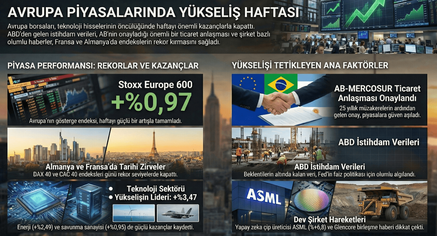 Avrupa borsaları, ABD istihdam verilerindeki yavaşlama ve ticaret anlaşması onaylarının ardından teknoloji hisseleri öncülüğünde haftayı yükselişle kapattı. Piyasalar, haftanın son işlem gününde pozitif bir seyir izleyerek günü kazançlarla tamamladı. Gösterge endeks Stoxx Europe 600, Avrupa Birliği ülkelerinin Güney Ortak Pazarı ile yürütülen ticaret anlaşmasını onaylamasının etkisiyle yüzde 0,97 oranında artış kaydederek 609.67 puana ulaştı. Teknoloji hisselerinde görülen yüzde 3,47'lik ortalama yükseliş, tüm sektörleri olumlu etkileyen ana itici güç oldu. Savunma sanayisi yüzde 0,95, otomotiv ve yedek parça sektörü yüzde 0,67, bankacılık yüzde 0,63 ve enerji şirketleri yüzde 2,49 oranında değer kazandı. Alman ve Fransız borsalarında tarihi rekorlar Fransa'da CAC 40 ve Almanya'da DAX 40 endeksleri günü rekor seviyelerde tamamlayarak dikkatleri üzerine çekti. CAC 40 endeksi yüzde 1,44'lük bir artışla 8.362,09 puana, DAX 40 endeksi ise yüzde 0,53 yükselerek 25.261,64 puana çıktı. İngiltere'de FTSE 100 endeksi yüzde 0,80'lik yükselişle 10.124,6 puana ulaşırken, İtalya'da FTSE MIB 30 endeksi yüzde 0,10 artışla 45.719,26 puandan işlem gördü. Analistler, yeni yılda yaşanan jeopolitik gerginliklerin piyasaları olumsuz etkilemediğini, aksine ekonomik dinamizmin korunduğunu ifade etti. Yapay zeka yatırımları ve dev birleşme adımları Şirket bazlı hareketlerde yapay zeka ve emtia sektörleri ön plana çıktı. Hollandalı çip ekipmanları üreticisi ASML’nin hisseleri, yarı iletken sektöründeki olumlu beklentilerin etkisiyle yüzde 6,8 oranında yükseldi. Emtia tarafında ise Glencore ve Rio Tinto arasındaki birleşme görüşmeleri piyasanın ana gündem maddesi haline geldi. Glencore'un rakibiyle ön görüşmeler yaptığını duyurması üzerine şirketin hisseleri yüzde 9,75 artış gösterirken, Rio Tinto hisseleri yüzde 3,4 geriledi. Olası bir anlaşmanın, toplam değeri 260 milyar doları aşan dünyanın en büyük emtia şirketini ortaya çıkarabileceği öngörüldü. ABD istihdam verileri ve ticaret anlaşması onayı ABD'de açıklanan tarım dışı istihdam verileri, Federal Rezerv Bankası'nın faiz politikası açısından yakından izlendi. Aralık ayında istihdam 50 bin kişi artarak beklentilerin altında kalırken, işsizlik oranı yüzde 4,5'ten yüzde 4,4'e geriledi. Diğer taraftan, AB üyesi ülkeler MERCOSUR ile 25 yıldır müzakere edilen ticaret anlaşmasını onayladı. Avrupa Komisyonu Başkanı Ursula von der Leyen'in gelecek hafta Güney Amerika ülkeleriyle resmi imzaları atması bekleniyor. Anlaşma, Avrupa'daki çiftçilerin rekabet endişesiyle yürüttüğü protestolara rağmen yürürlüğe girme aşamasına geldi.