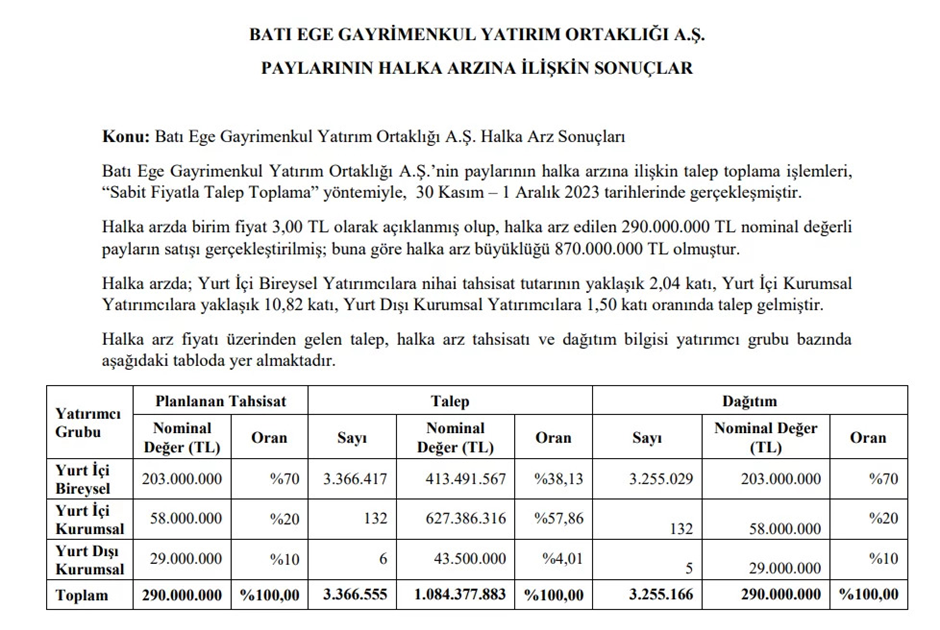 Batı Ege Gayrimenkul Yatırım Ortaklığı AŞ halka arz büyüklüğü 870 milyon TL oldu. Peki, BEGYO bireysel yatırımcılara kaç lot verdi? İşte detaylar... Batı Ege GYO'nun paylarının halka arzına ilişkin talep toplama işlemleri, “Sabit Fiyatla Talep Toplama” yöntemiyle, 30 Kasım – 1 Aralık 2023 tarihlerinde gerçekleştirildi. Halk Yatırım'dan KAP'a yapılan açıklamaya göre, halka arzda birim fiyat 3,00 TL olarak açıklanmış olup, halka arz edilen 290.000.000 TL nominal değerli payların satışı gerçekleştirildi. Buna göre halka arz büyüklüğü 870.000.000 TL oldu. Halka arzda; Yurt İçi Bireysel Yatırımcılara nihai tahsisat tutarının yaklaşık 2,04 katı, Yurt İçi Kurumsal Yatırımcılara yaklaşık 10,82 katı, Yurt Dışı Kurumsal Yatırımcılara 1,50 katı oranında talep geldi. Batı Ege GYO (BEGYO) halka arzında bireysel yatırımcılara kişi başı azami 64-65 lot hisse dağıtımı yapıldı. Batı Ege Gayrimenkul Yatırım Ortaklığı A.Ş. (BEGYO) paylarının halka arzında, payların %5`inden fazlasını alan gerçek/tüzel kişi ise olmadı. Kaynak: KAP [news_id:716715] [news_id:716795]