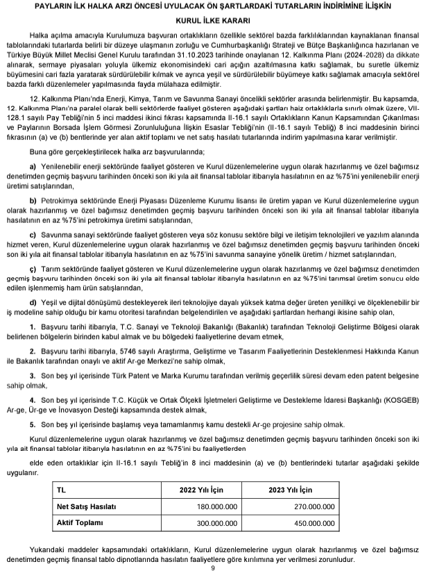 SPK, belli sektörlerde payların ilk halka arzı öncesi uyulacak ön şart tutarlarında indirime gitti. Söz konusu kararın, 2024-2028 yıllarını kapsayan 12. Kalkınma Planı doğrultusunda alındığına yer verilen SPK bülteninde, böylece Türkiye'nin cari açığın azaltılmasına katkı sağlanacağı ayrıca yeşil ve sürdürülebilir büyümeye katkı verileceği ifade edildi. SPK haftalık bülteninde yer alan ilke kararında ise şu bilgiler verildi: "Halka açılma amacıyla Kurulumuza başvuran ortaklıkların özellikle sektörel bazda farklılıklarından kaynaklanan finansal tablolarındaki tutarlarda belirli bir düzeye ulaşmanın zorluğu ve Cumhurbaşkanlığı Strateji ve Bütçe Başkanlığınca hazırlanan ve Türkiye Büyük Millet Meclisi Genel Kurulu tarafından 31.10.2023 tarihinde onaylanan 12. Kalkınma Planı (2024-2028) da dikkate alınarak, sermaye piyasaları yoluyla ülkemiz ekonomisindeki cari açığın azaltılmasına katkı sağlamak, bu suretle ülkemiz büyümesini cari fazla yaratarak sürdürülebilir kılmak ve ayrıca yeşil ve sürdürülebilir büyümeye katkı sağlamak amacıyla sektörel bazda farklı düzenlemeler yapılmasında fayda mülahaza edilmiştir. 12. Kalkınma Planı’nda Enerji, Kimya, Tarım ve Savunma Sanayi öncelikli sektörler arasında belirlenmiştir. Bu kapsamda, 12. Kalkınma Planı’na paralel olarak belli sektörlerde faaliyet gösteren aşağıdaki şartları haiz ortaklıklarla sınırlı olmak üzere, VII128.1 sayılı Pay Tebliği’nin 5 inci maddesi ikinci fıkrası kapsamında II-16.1 sayılı Ortaklıkların Kanun Kapsamından Çıkarılması ve Paylarının Borsada İşlem Görmesi Zorunluluğuna İlişkin Esaslar Tebliği’nin (II-16.1 sayılı Tebliğ) 8 inci maddesinin birinci fıkrasının (a) ve (b) bentlerinde yer alan aktif toplamı ve net satış hasılatı tutarlarında indirim yapılmasına karar verilmiştir. Buna göre gerçekleştirilecek halka arz başvurularında; a) Yenilenebilir enerji sektöründe faaliyet gösteren ve Kurul düzenlemelerine uygun olarak hazırlanmış ve özel bağımsız denetimden geçmiş başvuru tarihinden önceki son iki yıla ait finansal tablolar itibarıyla hasılatının en az %75’ini yenilenebilir enerji üretimi satışlarından, b) Petrokimya sektöründe Enerji Piyasası Düzenleme Kurumu lisansı ile üretim yapan ve Kurul düzenlemelerine uygun olarak hazırlanmış ve özel bağımsız denetimden geçmiş başvuru tarihinden önceki son iki yıla ait finansal tablolar itibarıyla hasılatının en az %75’ini petrokimya üretimi satışlarından, c) Savunma sanayi sektöründe faaliyet gösteren veya söz konusu sektöre bilgi ve iletişim teknolojileri ve yazılım alanında hizmet veren, Kurul düzenlemelerine uygun olarak hazırlanmış ve özel bağımsız denetimden geçmiş başvuru tarihinden önceki son iki yıla ait finansal tablolar itibarıyla hasılatının en az %75’ini savunma sanayine yönelik üretim / hizmet satışlarından, ç) Tarım sektöründe faaliyet gösteren ve Kurul düzenlemelerine uygun olarak hazırlanmış ve özel bağımsız denetimden geçmiş başvuru tarihinden önceki son iki yıla ait finansal tablolar itibarıyla hasılatının en az %75’ini tarımsal üretim sonucu elde edilen işlenmemiş ham ürün satışlarından, d) Yeşil ve dijital dönüşümü destekleyerek ileri teknolojiye dayalı yüksek katma değer üreten yenilikçi ve ölçeklenebilir bir iş modeline sahip olduğu bir kamu otoritesi tarafından belgelendirilen ve aşağıdaki şartlardan herhangi ikisine sahip olan, 1. Başvuru tarihi itibarıyla, T.C. Sanayi ve Teknoloji Bakanlığı (Bakanlık) tarafından Teknoloji Geliştirme Bölgesi olarak belirlenen bölgelerin birinden kabul almak ve bu bölgedeki faaliyetlerine devam etmek, 2. Başvuru tarihi itibarıyla, 5746 sayılı Araştırma, Geliştirme ve Tasarım Faaliyetlerinin Desteklenmesi Hakkında Kanun ile Bakanlık tarafından onaylı ve aktif Ar-ge Merkezi’ne sahip olmak, 3. Son beş yıl içerisinde Türk Patent ve Marka Kurumu tarafından verilmiş geçerlilik süresi devam eden patent belgesine sahip olmak, 4. Son beş yıl içerisinde T.C. Küçük ve Ortak Ölçekli İşletmeleri Geliştirme ve Destekleme İdaresi Başkanlığı (KOSGEB) Ar-ge, Ür-ge ve İnovasyon Desteği kapsamında destek almak, 5. Son beş yıl içerisinde başlamış veya tamamlanmış kamu destekli Ar-ge projesine sahip olmak. Kurul düzenlemelerine uygun olarak hazırlanmış ve özel bağımsız denetimden geçmiş başvuru tarihinden önceki son iki yıla ait finansal tablolar itibarıyla hasılatının en az %75’ini bu faaliyetlerden elde eden ortaklıklar için II-16.1 sayılı Tebliğ’in 8 inci maddesinin (a) ve (b) bentlerindeki tutarlar aşağıdaki şekilde uygulanır. TL 2022 2023 Net Satış Hasılatı 180.000.000 270.000.000 Aktif Toplamı 300.000.000 450.000.000 Yukarıdaki maddeler kapsamındaki ortaklıkların, Kurul düzenlemelerine uygun olarak hazırlanmış ve özel bağımsız denetimden geçmiş finansal tablo dipnotlarında hasılatın faaliyetlere göre kırılımına yer verilmesi zorunludur." Kaynak: SPK Bülteni 2024/17