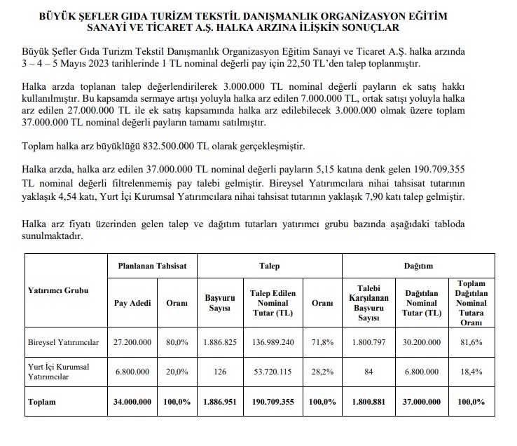 BigChefs halka arz büyüklüğü 832,5 milyon TL olurken, bireysel yatırımcıya 17 lot dağıtım yapılması bekleniyor. BigChefs (Büyük Şefler Gıda Turizm Tekstil Danışmanlık Organizasyon Eğitim Sanayi ve Ticaret AŞ) halka arzında 3 - 4 - 5 Mayıs 2023 tarihlerinde 1 TL nominal değerli pay için 22,50 TL’den talep toplandı. Deniz Yatırım'dan KAP'a yapılan açıklamaya göre, halka arzda toplanan talep değerlendirilerek 3.000.000 TL nominal değerli payların ek satış hakkı kullanıldı. Bu kapsamda sermaye artışı yoluyla halka arz edilen 7.000.000 TL, ortak satışı yoluyla halka arz edilen 27.000.000 TL ile ek satış kapsamında halka arz edilebilecek 3.000.000 olmak üzere toplam 37.000.000 TL nominal değerli payların tamamı satıldı. Toplam halka arz büyüklüğü ise 832.500.000 TL olarak gerçekleşti. Halka arzda, halka arz edilen 37.000.000 TL nominal değerli payların 5,15 katına denk gelen 190.709.355 TL nominal değerli filtrelenmemiş pay talebi geldi. Bireysel Yatırımcılara nihai tahsisat tutarının yaklaşık 4,54 katı, Yurt İçi Kurumsal Yatırımcılara nihai tahsisat tutarının yaklaşık 7,90 katı talep geldi. Gelen talebe göre bireysel yatırımcıya ise 17 lot dağıtım yapılacağı tahmin ediliyor. Halka arz fiyatı üzerinden gelen talep ve dağıtım tutarları yatırımcı grubu bazında aşağıdaki tabloda sunulmaktadır. Kaynak: KAP Tıklayın: SPK'den iki şirketin halka arzına onay geldi!