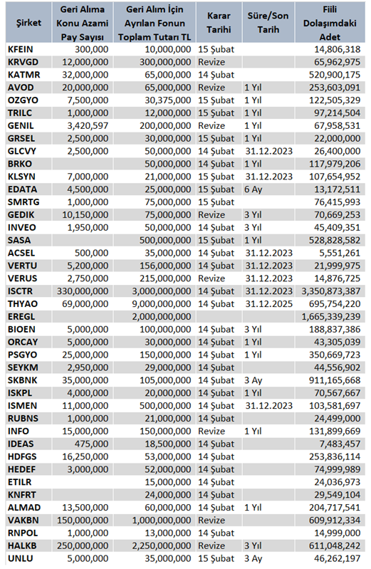 2022 yılının başından beri değer kaybını sürdüren ve deprem felaketinin ardından hareketliliğin arttığı Borsa İstanbul'da şirketler, getirilen teşviklerden sonra hisse geri alımına başladı. Buna göre şirketlerin pay geri alım miktarları ve tutarları şöyle: Kaynak: Matriks Haber Türk Hava Yolları (THYAO) , pay geri alımı için ayrılabilecek azami fon tutarını, 9.000.000.000 TL olarak ve geri alınacak azami pay sayısının ortaklığın çıkarılmış sermayesinin yüzde 5'i ile sınırlandırılacak. Hisse geri alım programı 3 takvim yılını kapsayacak. Halkbank'ın (HLBNK) KAP'a yaptığı açıklamada , 3 yıllık süre için; daha önce alımına karar verilen 120 milyon lira nominal hisseye 130 milyon lira nominal hisse ilave olarak toplamda 250 milyon lira nominal hisse (25.000.000.000 adet pay) ve daha önce açıklanan azami 750 milyon lira satış tutarına 1 milyar 500 milyon lira ilave olarak azami 2 milyar 250 milyon lira satış tutarına kadar bankanın Borsa İstanbul'da işlem gören halka açık paylarının geri alınmasına dair limitlerin artırılmasına karar verildiği ifade edildi. Sasa Polyester A.Ş. (SASA), pay geri alımı için ayrılabilecek azami fon tutarını, 500.000.000 TL olacak ve geri alınacak azami pay sayısının ise bu tutarı geçmeyecek şekilde belirlenmiştir. Hisse geri alım programı 1 yılı kapsayacak. Verusa Holding (VERUS); 11.05.2022 tarihli Yönetim Kurulu Kararı ile belirlenen geri alım işlemi için ayrılan 105.000.000 TL tutarındaki fonun azami 215.000.000 TL, geri alıma konu edilebilecek 1.750.000 adet pay sayısının azami 2.750.000 adet olarak revize edilmesine karar verdiğini açıklamıştır. Ereğli Demir Çelik (EREGL), şirketin kendi paylarını geri alması için 2 milyar TL fon ayrılmasına karar verdi. Pay geri alımına ilişkin gerekli her türlü işlemi yapmak üzere Yönetim Kurulu Üyesi ve Murahhas Aza ile Finansal Yönetim ve Mali İşler Grup Başkan Yardımcısı'nın münferiden yetkilendirilmelerine kararı alındı. Türkiye İş Bankası A.Ş (ISCTR) , pay geri alımı için ayrılabilecek azami fon tutarını 3 .000.000.000 TL olarak ve geri alınacak azami hisse adedinin ise 330 milyon olarak belirledi. Belirlenen limitler dahilindeki geri alım işlemlerinin yerine getirilmesi için Genel Müdürlük 31.12.2023 tarihine kadar yetkili kılınmıştır. Birko Birleşik Yönetim Kurulu (BRKO)yaptığı toplantısında pay geri alımı için ayrılabilecek azami fon tutarının 50.000.000 TL olarak ve geri alınacak azami hisse adedinin ise bu tutarı geçmeyecek şekilde belirlenmesine karar verildi. Biotrend Çevre ve Enerji Yatırımları (BIOEN) pay geri alım işlemlerinin yapılmasına ilişkin olarak ayrılacak olan fonun şirketin öz kaynaklarından karşılanmak üzere en fazla 100.000.000 TL olarak belirlenmesine ve geri alınacak azami pay sayısının ise 5.000.000 adet olarak belirlenmesine karar verdi. İş Yatırım Menkul Değerler A.Ş. (ISMEN), şirketin paylarının azami 11.000.000 adedinin 31.12.2023 tarihine kadar Borsa İstanbul Pay Piyasası'nda geri alınabilmesine ve geri alım için azami 500.000.000 TL fon tahsis edilmesine karar verdi. Işık Plastik Sanayi ve Dış Ticaret Pazarlama A.Ş (ISKLP), pay geri alımı için ayrılabilecek azami fon tutarının 20.000.000 TL ve geri alınacak azami hisse adedinin ise 4.000.000 adet (4.000.000 TL nominal) olarak belirlendiğini duyurdu. Paylarının geri alım programı süresi, 14.02.2024 tarihinde sona erecek şekilde 1 yıl olarak belirlendi. Orçay (ORCAY) pay geri alımı için ayrılabilecek azami fon tutarının 30.000.000 TL olarak veya alınacak azami hisse adedinin 5.000.000'u geçmeyecek şekilde belirlenmesine karar verdi. Pay geri alım programı, azami 1 yıl süreyle geçerli olacak. Pasifik Gayrimenkul Yatırım Ortaklığı (PSGYO), pay geri alımı için ayrılabilecek azami fon tutarının 150.000.000 TL olarak veya alınacak azami hisse adedinin 25.000.000'i geçmeyecek şekilde belirlenmesine karar verdi. Rubenis Tekstil Sanayi Ticaret A.Ş. (RUBNS) Borsa İstanbul'da işlem gören paylarının, şirketin performansını yansıtmaması sebebiyle pay geri alımı yapma kararı aldı. Pay geri alım için ayrılacak fon, Şirketin en fazla 21.000.000 TL olacak ve geri alınacak azami pay sayısı 1.000.000 adet pay olarak belirlendi. İnfo Yatırım (INFO), mevcut geri alım programını revize ederek pay geri alımına konu edilebilecek azami pay sayısının şirket sermayesinin yüzde 6,58'sine karşılık gelen 15.000.000 TL nominal değerli 15.000.000 adet pay olarak belirlenmesi kararını aldı. Payların geri alımı için ayrılacak fon en fazla 150.000.000 TL olacak. Geri alım süresi ise bir yıl olarak belirlendi. Smart Güneş Teknolojileri (SMRTG), geri alıma konu edilebilecek azami pay sayısının, şirketin çıkarılmış sermayesinin yaklaşık yüzde 0,327'sini temsil eden 1.000.000 TL nominal değerde 1.000.000 adet pay olarak belirlenmesine, ayrılacak olan fonun şirketin öz kaynaklarından karşılanmak üzere en fazla 75.000.000,00 TL olacağını duyurdu. Şekerbank T.A.Ş. (SKBNK), hisselerinin 3 ay süre ile 35.000.000 TL nominal tutarlı paya kadar geri alınabilmesi, pay geri alımı için azami fon tutarının 105.000.000 TL olarak belirlenmesine karar verdi. İdeal Finansal Teknolojiler (IDEAS), pay geri alımına konu edilebilecek azami pay sayısının şirket sermayesinin yüzde 5'ine karşılık gelen 475.000 TL nominal değerli 475.000 adet pay olarak belirlenmesine karar verdi. Payların geri alımı için ayrılacak fon, şirket özkaynaklarından karşılanmak üzere en fazla 18.500.000 TL olacak. Hedef Girişim (HDFGS), pay geri alımına konu edilebilecek azami pay sayısını şirket sermayesinin yüzde 5'ine karşılık gelen 16.250.000 TL nominal değerli 16.250.000 adet pay olarak belirledi. Payların geri alımı i