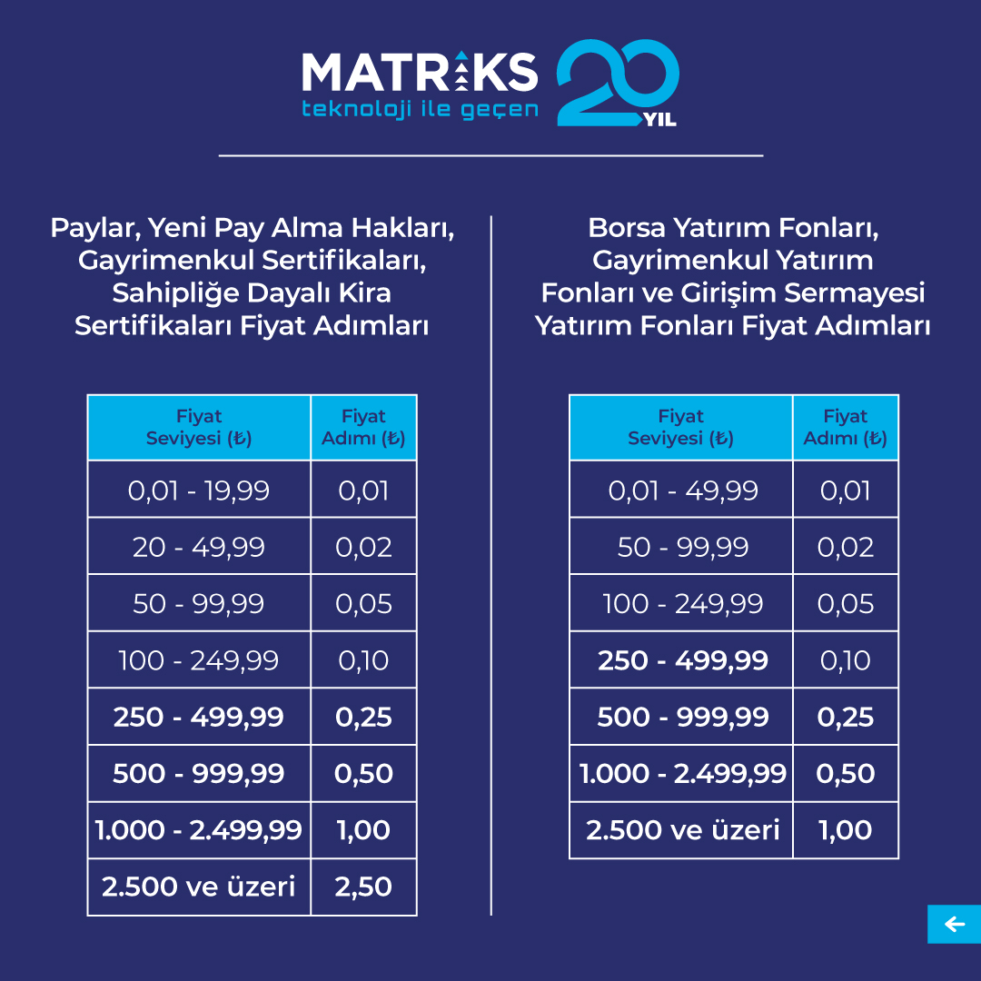 Borsa İstanbul, fiyat adımlarında değişikliğe hazırlanıyor. İlgili değişikliklerin 6 Kasım 2023’ten itibaren geçerli olması bekleniyor. Peki, yeni düzenleme ne anlama geliyor? İşte detaylar... Matriks Yönetim Kurulu Üyesi ve Genel Müdür Yardımcısı Cem Tutar, sosyal medya hesabından yaptığı paylaşımda, hafta sonunda Borsa İstanbul'da fiyat adımları ile ilgili değişiklikler olacağını belirterek, şunları kaydetti: “Değişiklikten fiyatı 250 TL ve üstü olan pay senetleri, gayrimenkul sertifikaları, sahipliğe dayalı kira sertifikaları ile fiyatı 500 TL üstü olan borsa yatırım fonları, gayrimenkul yatırım fonları ve girişim sermayesi yatırım fonları etkilenecektir. Pay piyasası yeni fiyat adımları 6 Kasım 2023 Pazartesi'den itibaren geçerli olacaktır. Bu akşam seans kapandıktan sonra girilen emirlerin yeni fiyat adımları ile uyumlu olması gerekmektedir. Herhangi bir olumsuz durum yaşanmaması için bu akşam seans kapandıktan sonra veya hafta sonu girilen emirlerin pazartesi sabahı kontrol edilmesi önerilmektedir." Buna göre paylar, yeni pay alma hakları, gayrimenkul sertifikaları, sahipliğe dayalı kira sertifikaları, borsa yatırım fonları, gayrimenkul yatırım fonları ve girişim sermayesi yatırım fonları işlem sıralarında geçerli olan fiyat adımı uygulaması aşağıdaki tablolarda yer aldığı şekilde yeniden düzenlendi: Kaynak: Matriks Trader Matriks Yönetim Kurulu Üyesi ve Genel Müdür Yardımcısı Cem Tutar ayrıca düzenlemenin ne anlama geldiğini de şu sözlerle yanıtladı: “Fiyat adımını en en basit hali ile alış-satış fiyatı arasındaki fark olarak görebilirsiniz. Bu değişiklikten fiyatı 250 TL ve üstü olan pay senetleri, gayrimenkul sertifikaları, sahipliğe dayalı kira sertifikaları ile fiyatı 500 TL üstü olan borsa yatırım fonları, gayrimenkul yatırım fonları ve girişim sermayesi yatırım fonları etkilenecektir. Pay piyasası yeni fiyat adımları 6 Kasım 2023 Pazartesi'den itibaren geçerli olacaktır. Örneğin senedin fiyatı 20 lira ile 49.99 arasında ise fiyat adımı değişmedi yine 2 kuruş, bu durumda pazartesi günü bu senette alış satış farkı neden 10 kuruş hani 2 olacaktı diye mesajlar gelecek sanırım. Hatırlatmakta fayda var kademeler arası boşluklar oluşabilir o ayrı bir konudur ama o boşluk fiyat adımın katları şeklinde olur. Alış ve satış kademeleri ve takip eden bekleyen kademler arasında minimum boşluk fiyat adımı kadardır diyelim. Fiyat adımı küçülürse teorik olarak kademeler arası hareketlilik artar büyürse azalır. Elbette fiyat adımı/fiyat oranına bakarak.”