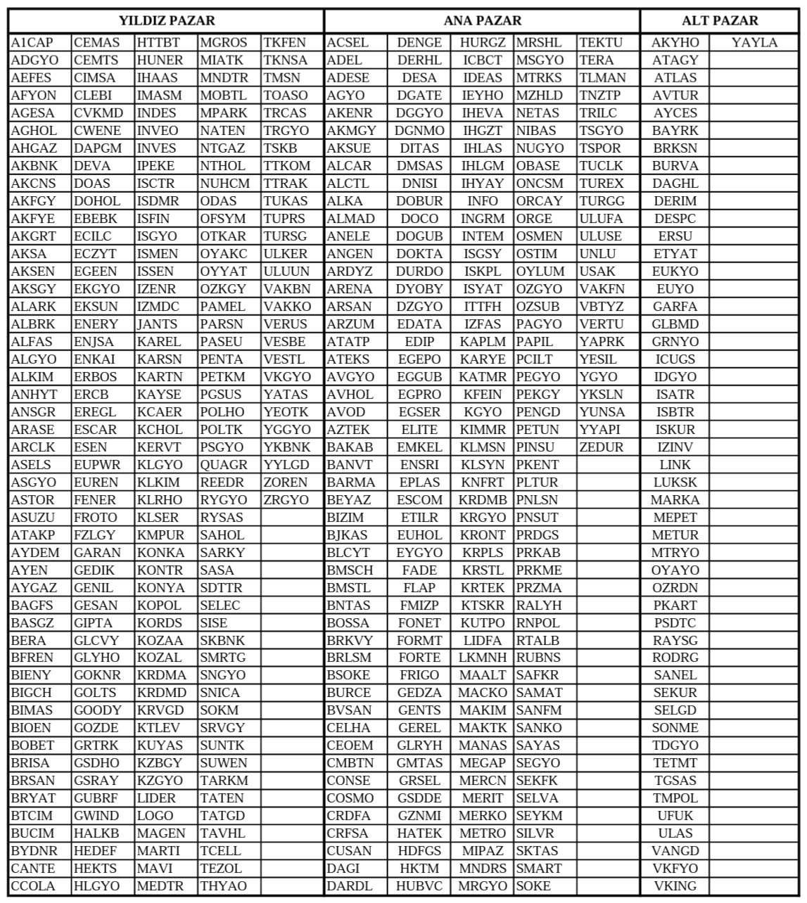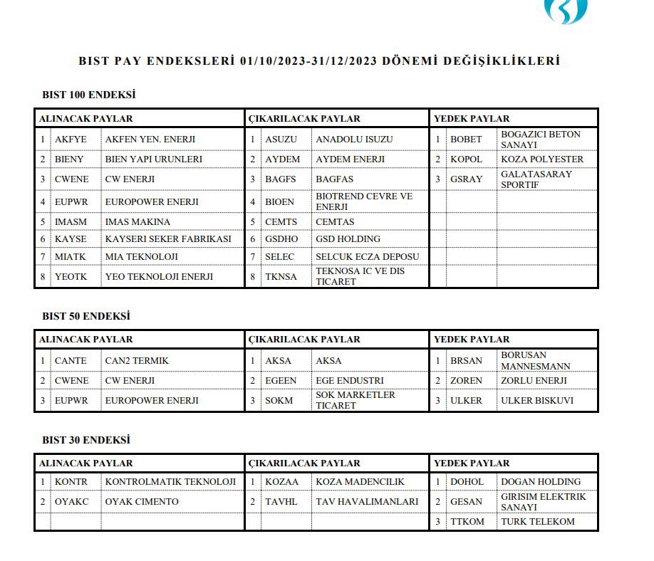 Borsa İstanbul A.Ş. tarafından KAP'a 21 Eylül 2023 tarihinde yapılan bildirimde, Borsa İstanbul’da işlem gören hisselerde yapılan endeks ve pazar değişikliklerine ilişkin açıklama yapıldı. Buna göre konuyla ilgili duyuruda şunlar kaydedildi: “Yıldız Pazar için piyasa değeri 1 milyar Tl den 3 milyar TL ye fiili dolaşımdaki payların piyasa değeri 150 milyon tl den 450 milyon TL’ye yerli fon tutarı 5 milyon TL den 15 milyon TL’ye yükseltilip likidite değeri 1,5'ten 0,5'e düşürülmüştür. Ana pazar için piyasa değeri 150 milyon TL den 450 milyon TL’ye fiili dolaşımdaki payların piyasa değeri 60 milyon TL den 180 milyon TL’ye yükseltilmiş olup likidite değeri 5'ten 1,5'e düşürülmüştür. Yıldız pazar için uygulanan istisnada fiili dolaşımdaki payların piyasa değeri 1,25 milyar TL'den 1,5 milyar TL'ye yükseltip, likidite değeri 1,5'ten 0,5'e düşürülmüştür." Yıldız Pazar, Ana Pazar ve Alt Pazarda işlem görecek payların dağılımı ise şöyle listelendi: Kaynak: BIST Öte yandan Borsa İstanbul bir başka duyuruda, 02/10/2023 tarihinden itibaren BIST 100, BIST 50 ve BIST 30 endekslerinde işlem görecek payların değişimini şöyle açıkladı: Kaynak: BIST BIST 100, BIST 50 ve BIST 30 endekslerine alınacak şirketlerden OYAKC dışındaki tüm şirketlerin son 4 yılda halka arz olmuş olması ise dikkat çekti. [article_id:173]