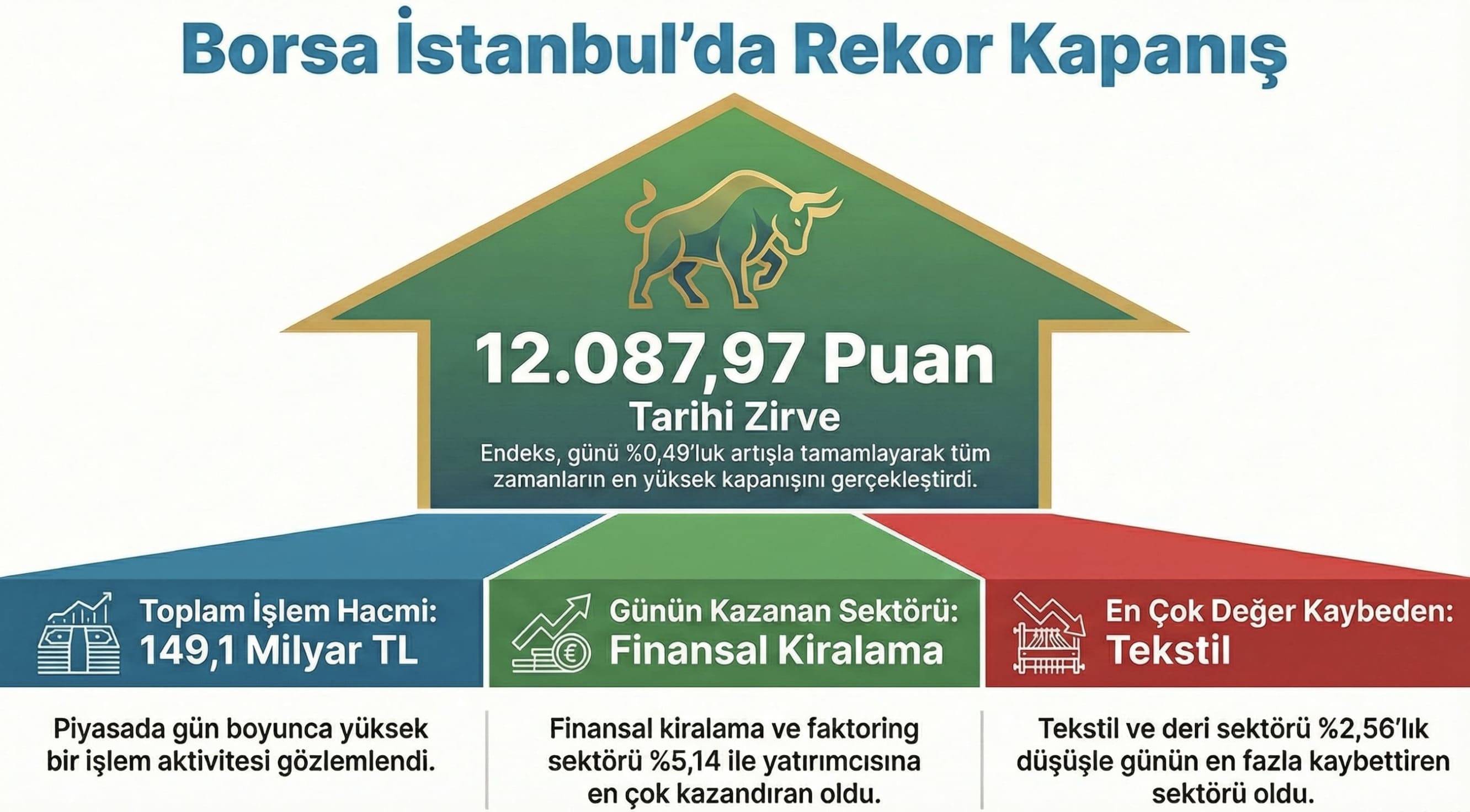 Borsa İstanbul'da BIST 100 endeksi günü yüzde 0,49 oranında yükselişle 12.087,97 puandan tamamlayarak tüm zamanların en yüksek kapanışını gerçekleştirdi. BIST 100 endeksi, önceki kapanış değerine kıyasla 59,13 puanlık bir artış kaydetti ve piyasadaki toplam işlem hacmi 149,1 milyar lira seviyesinde oluştu. Bankacılık endeksinin yüzde 0,23, holding endeksinin ise yüzde 0,41 oranında değer kazandığı işlem gününde, sektör bazlı ayrışmalar dikkat çekti. Sektör endeksleri arasında yatırımcısına en çok kazancı yüzde 5,14 ile finansal kiralama faktoring sağlarken, en fazla kaybı yüzde 2,56 ile tekstil deri sektörü yaşadı. Küresel piyasaların odağında ABD verileri var Küresel piyasalarda yatırımcıların dikkati, ABD'de yarın yayımlanacak olan istihdam verilerine odaklandı. Yurt içinde ise BIST 100 endeksi seans içerisinde 12.152,59 puana kadar yükselerek yeni bir rekor kırdı ve yedi günlük pozitif serisini korumayı başardı. Endeks, gün sonunda elde ettiği kazanımlarla tarihi zirvesini tazeleyerek kapanış yaptı. Yeni gündemde sanayi üretimi ve dış ticaret verileri öne çıkıyor Analistler, gelecek işlem gününde yurt içinde sanayi üretimi verilerinin, yurt dışında ise ABD istihdam rakamları, Çin enflasyonu ve Almanya dış ticaret dengesi gibi yoğun bir veri ajandasının takip edileceğini bildirdi. Teknik açıdan endeksin hareketlerini değerlendiren uzmanlar, BIST 100 için 12.200 ve 12.300 puan seviyelerinin direnç, 12.000 ve 11.900 puan seviyelerinin ise destek noktaları olarak izlendiğini dile getirdi.