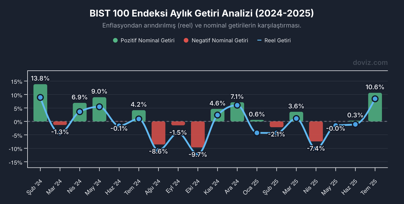 Temmuz ayında borsada yaşanan yükseliş ile enflasyondaki düşüş birleşerek yatırımcısına son 17 ayın en yüksek reel kazancını getirdi. Endeks, diğer tüm yatırım araçlarını geride bırakarak Temmuz ayının en çok kazandıran yatırım aracı oldu. AA muhabirinin Türkiye İstatistik Kurumu verilerinden derlediği bilgilere göre, borsadaki toparlanma süreci reel getiri oranlarına da yansıdı. Haziran ayında 9 bin seviyelerinde işlem gören BIST 100 endeksi, Temmuz ayında yönünü yukarı çevirdi. Türkiye Cumhuriyet Merkez Bankasının faiz indirdiği Temmuz ayında yeniden 10 bin seviyesini aşan endeks, kısa süre içinde 11 bin düzeyinin üzerine çıktı. Borsadaki bu yükselişin yanı sıra Temmuz ayında enflasyondaki gerileme eğilimi de sürdü. Tüketici fiyat endeksi yüzde 33,5 ile son 44 ayın en düşük seviyesine indi. YATIRIM ARAÇLARI ARASINDA LİDER BIST 100 endeksi, Temmuz ayında borsadaki yükseliş ve enflasyondaki gerileme ile birlikte mevduat faizi, altın ve dolar gibi yatırım araçlarını geride bırakarak ayın en yüksek reel getirisini sağladı. Endeks, Temmuz ayında yüzde 10,63 nominal getiri elde ederken enflasyonu yüzde 8,4 oranında geride bıraktı. Böylece BIST 100 endeksi, 17 ay sonra yeniden yüzde 8’in üzerinde reel getiri oranına ulaştı ve yatırımcısına yüksek kazanç sundu. Aylık verilere bakıldığında Şubat 2024’te nominal yüzde 13,84, reel yüzde 8,91 ile başlayan süreç, zaman zaman eksiye geçen aylarla ilerledi. Mart ayında reel getiri yüzde -4,34’e inerken, Nisan’da yüzde 3,59, Mayıs’ta yüzde 5,44 olarak kaydedildi. Yılın ikinci yarısında dalgalanmalar artarak Ağustos’ta reel getiri yüzde -10,76’ya, Ekim’de yüzde -12,19’a düştü. 2025 yılına ise Ocak ayında yüzde -4,26, Şubat’ta yüzde -4,32 ile negatif başlayan endeks, Mart’ta yüzde 1,08, Nisan’da yüzde -10,14, Mayıs’ta yüzde -1,53, Haziran’da yüzde -1,10 getiri sundu. Temmuz 2025 ise bu tablonun içindeki tek parlak ay olarak nominal yüzde 10,63 ve reel yüzde 8,40 ile öne çıktı.