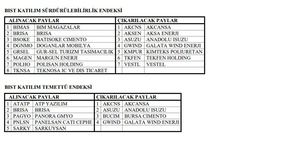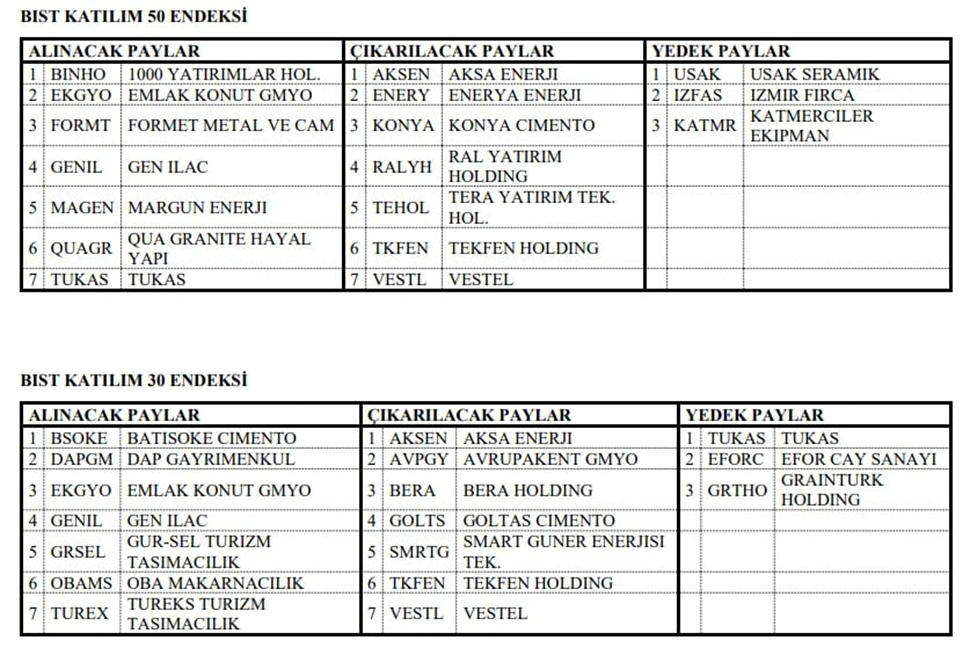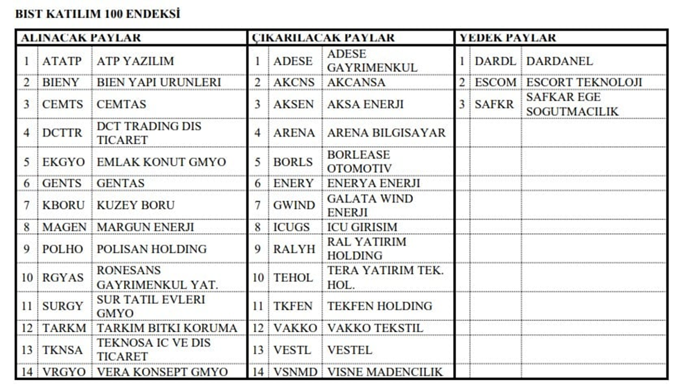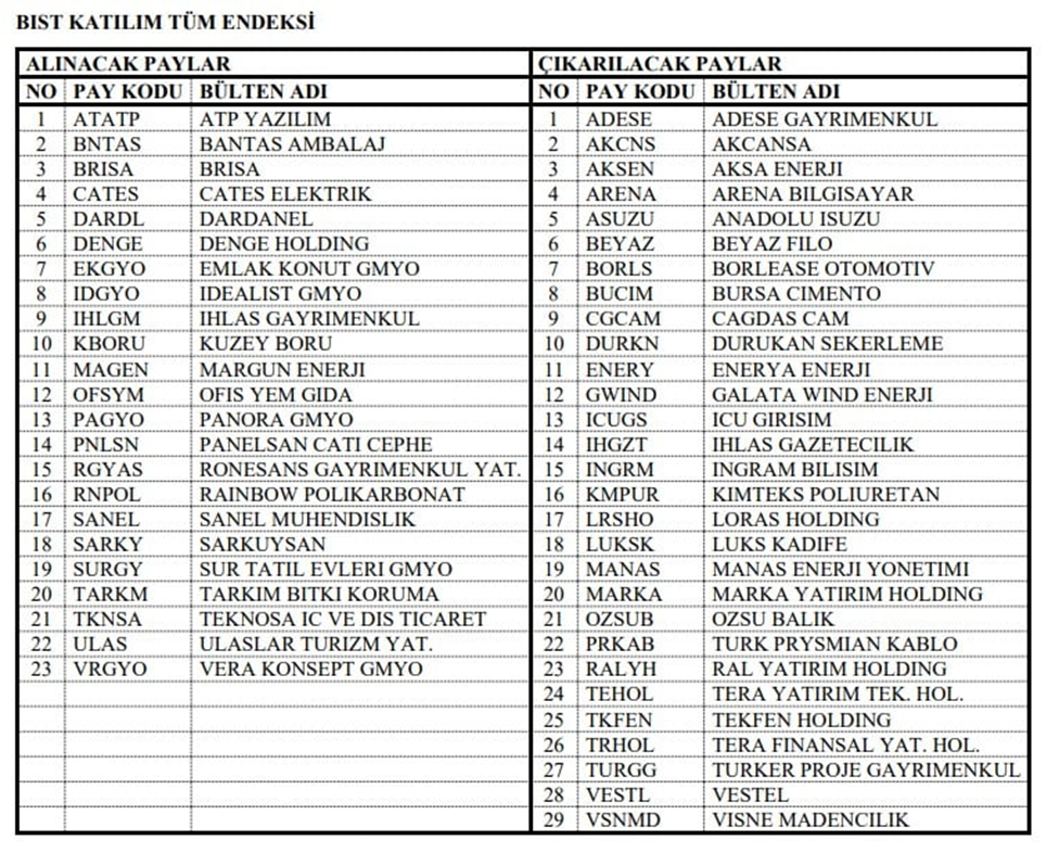 Borsa İstanbul (BİST), 1 Ekim 2025 – 30 Nisan 2026 döneminde geçerli olacak Katılım Endeksi içerisinde yer alan şirketlere yönelik revizyonlarını açıkladı. Borsa İstanbul, BIST Katılım Endeksleri’ne yönelik değişiklikleri duyurdu. Kamuyu Aydınlatma Platformu’na (KAP) yapılan açıklamaya göre BIST Katılım Tüm, BIST Katılım 100, BIST Katılım 50, BIST Katılım 30, BIST Katılım Sürdürülebilirlik ve BIST Katılım Temettü endekslerinde 1 Ekim 2025 ile 30 Nisan 2026 döneminde geçerli olacak şekilde düzenlemeye gidildi. Düzenleme kapsamında 29 şirket BIST Katılım Tüm Endeksi’nden çıkarılırken 23 şirket yeni dönemde endekse dahil edildi. 1 Ekim 2025 tarihinden itibaren geçerli olacak endeks değişiklikleri şu şekilde sıralandı: [news_id:786358]