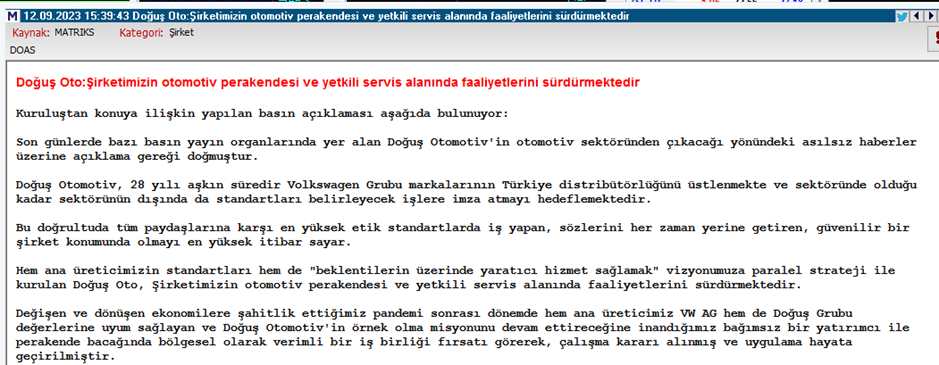 Doğuş Otomotiv'den yapılan açıklamada “otomotiv sektöründen çıkıyor” şeklinde basında yer alan haberlerin gerçeği yansıtmadığı bildirildi. Öte yandan konuyla ilgili paylaşılan bilgi notunda, bağımsız bir yatırımcı ile perakende bacağında bölgesel olarak verimli bir iş birliği fırsatı görerek çalışma kararı alındığının mesajı verildi. Otomotiv sektöründen çıkma gibi bir durumun olmadığının altını çizen firma, konuyla ilgili paylaşımında ise şunları kaydetti: “Son günlerde bazı basın yayın organlarında yer alan Doğuş Otomotiv’in otomotiv sektöründen çıkacağı yönündeki asılsız haberler üzerine açıklama gereği doğmuştur. Doğuş Otomotiv, 28 yılı aşkın süredir Volkswagen Grubu markalarının Türkiye distribütörlüğünü üstlenmekte ve sektöründe olduğu kadar sektörünün dışında da standartları belirleyecek işlere imza atmayı hedeflemektedir. Bu doğrultuda tüm paydaşlarına karşı en yüksek etik standartlarda iş yapan, sözlerini her zaman yerine getiren, güvenilir bir şirket konumunda olmayı en yüksek itibar sayar. Hem ana üreticimizin standartları hem de ‘beklentilerin üzerinde yaratıcı hizmet sağlamak’ vizyonumuza paralel strateji ile kurulan Doğuş Oto, şirketimizin otomotiv perakendesi ve yetkili servis alanında faaliyetlerini sürdürmektedir. Değişen ve dönüşen ekonomilere şahitlik ettiğimiz pandemi sonrası dönemde hem ana üreticimiz VW AG hem de Doğuş Grubu değerlerine uyum sağlayan ve Doğuş Otomotiv’in örnek olma misyonunu devam ettireceğine inandığımız bağımsız bir yatırımcı ile perakende bacağında bölgesel olarak verimli bir iş birliği fırsatı görerek, çalışma kararı alınmış ve uygulama hayata geçirilmiştir. Bu noktada, Doğuş Oto finansal ve operasyonel performans gösterdiği lokasyonlarda faaliyetlerine mevcut düzeninde devam etmektedir. Kurumsal stratejisini “müşteri memnuniyeti odaklı çalışma” hedefi üzerine inşa eden şirketimiz, koşulsuz müşteri memnuniyetini bir numaralı önceliği olarak ele almaya ve müşterilerine satış, servis ve yedek parça hizmetlerini yaygın ve kesintisiz bir şekilde sunmaya devam edecektir. Otomotiv sektörü, şirketimizin temel faaliyet alanlarından biridir ve şirketimiz bu alanda yatırımlarına devam edecektir. Tüm paydaşlarımıza ve kamuoyuna, otomotiv sektöründeki varlığımızı güçlendirme kararlılığımızı bir kez daha ifade etmek isteriz.” Kaynak: Matriks