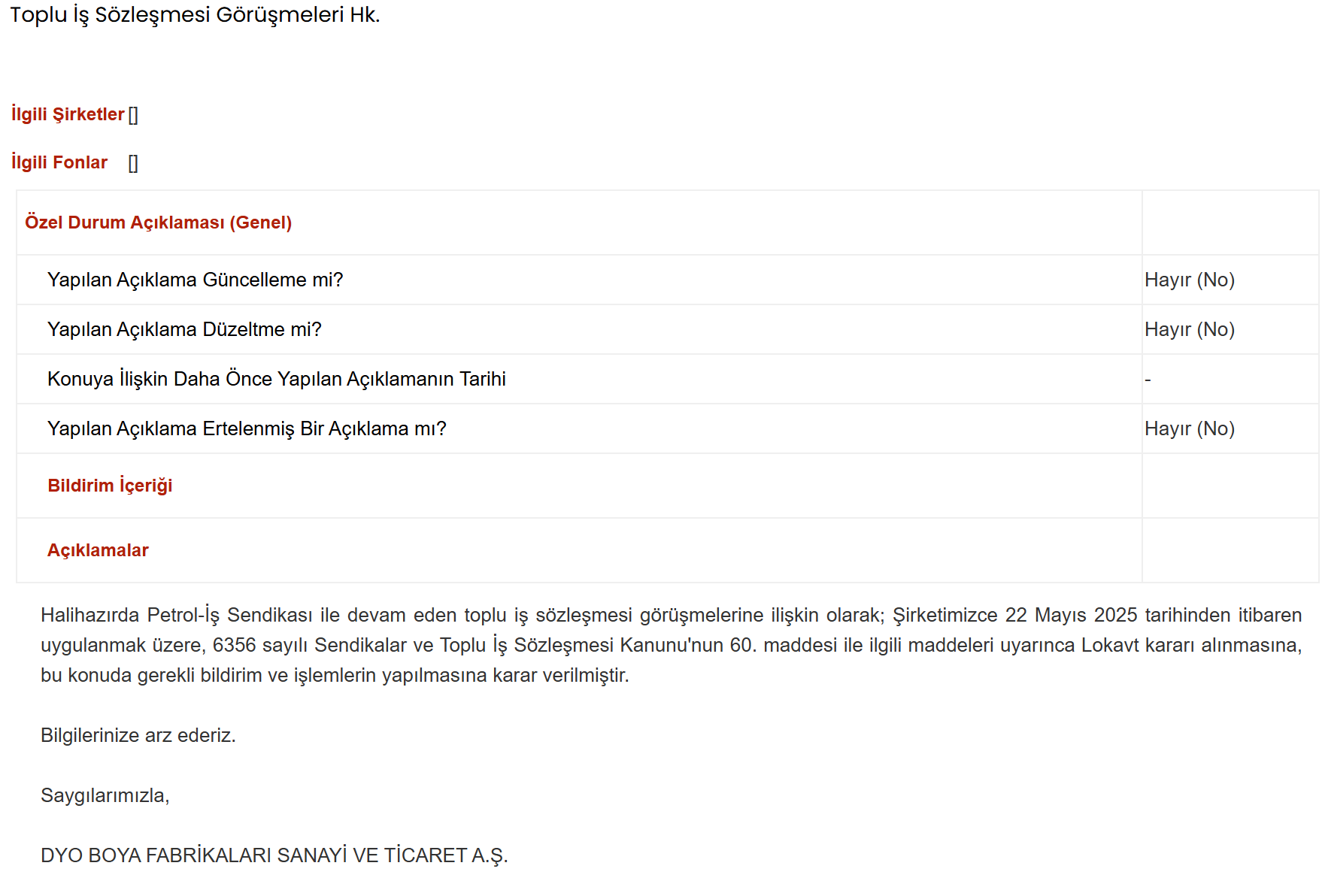 DYO Boya, Petrol-İş Sendikası ile yürütülen toplu iş sözleşmesi görüşmeleri kapsamında 22 Mayıs’tan itibaren geçerli olmak üzere lokavt kararı aldığını duyurdu. DYO Boya, Petrol-İş Sendikası ile yürütülen toplu iş sözleşmesi görüşmeleri kapsamında 22 Mayıs 2025 tarihinden itibaren geçerli olmak üzere lokavt kararı aldı. Şirket, bu kararını Kamuyu Aydınlatma Platformu’na (KAP) yaptığı açıklamayla duyurdu. Konuya ilişkin açıklamada, “Halihazırda Petrol-İş Sendikası ile devam eden toplu iş sözleşmesi görüşmelerine ilişkin olarak; Şirketimizce 22 Mayıs 2025 tarihinden itibaren uygulanmak üzere, 6356 sayılı Sendikalar ve Toplu İş Sözleşmesi Kanunu'nun 60. maddesi ile ilgili maddeleri uyarınca lokavt kararı alınmasına, bu konuda gerekli bildirim ve işlemlerin yapılmasına karar verilmiştir” denildi. Lokavt nedir? İşveren veya işveren vekili tarafından kendi teşebbüsü ile veya bir işveren kuruluşunun verdiği karara uyarak işçilerin, işyerinde faaliyetin tamamen durmasına sebep olacak tarzda, topluca işten uzaklaştırılmasına lokavt denilir. Kaynak: KAP