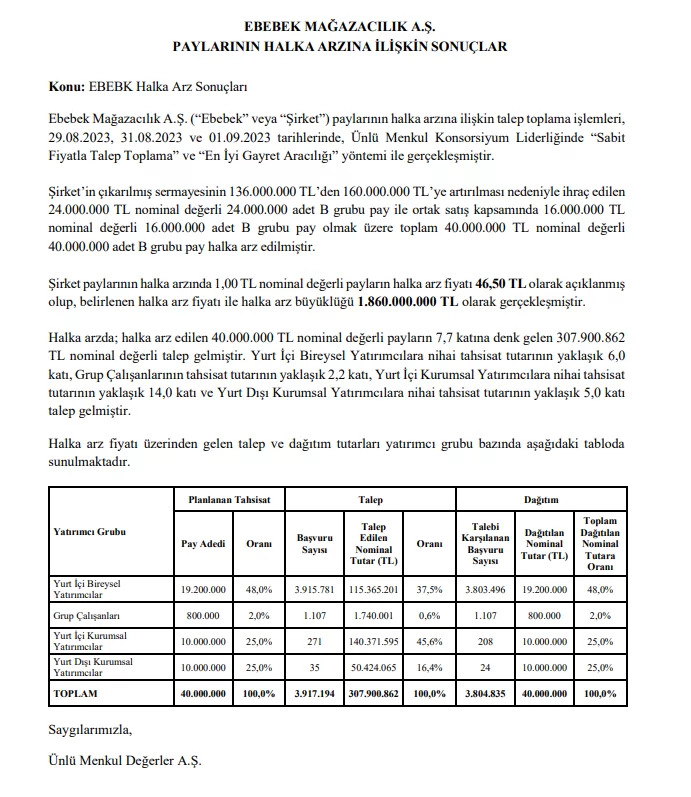 Ebebek’in halka arz büyüklüğü 1,86 milyar TL olurken, halka arza 3,9 milyon kişiden 7,7 kat talep geldi. Peki EBEBK bireysel yatırımcıya kaç lot verdi? İşte detaylar.. Ebebek Mağazacılık A.Ş. halka arzında hisse başına 46,50 TL fiyattan toplam 40 milyon adet hisse satılırken, toplam halka arz büyüklüğü 1,86 milyar TL oldu. İşleme aracılık eden Ünlü Menkul Değerler A.Ş. tarafından KAP’a yapılan açıklamaya göre halka arz edilen hisselerin yüzde 48’i yurt içi bireysel yatırımcılara, yüzde 25’i yurt içi kurumsal yatırımcılara, yüzde 25’i yurt dışı kurumsal yatırımcılara, yüzde 2’si de grup çalışanlarına dağıtıldı. Halka arz edilen hisselerin yüzde 5,25’ini East Capital, yüzde 5,25’ini Franklin Templeton Investments aldı. Ebebek Halka arzında bireysel yatırımcılara ise 5-6 lot hisse dağıtımı yapıldı. Kaynak: KAP