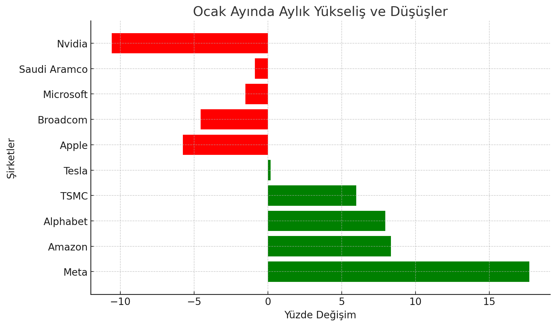Küresel piyasaların sert dalgalanmalar yaşadığı ocak ayında en değerli 10 şirketten en çok kazandıran Meta, en çok kaybettiren ise Nvidia oldu. Geçen ay küresel pay piyasalarında, ABD'de başkanlık koltuğuna oturan Donald Trump'ın tarife söylemleri ve Çin merkezli DeepSeek'in yapay zeka modelini piyasaya sürmesi sonrası ABD'li şirketlerin bu alandaki hakimiyetinin bozulabileceğine dair endişeler etkili oldu. Trump'ın ticari tarife söylemlerinin etkilerine yönelik belirsizlikler varlığını korumaya devam ederken, yeni ABD yönetiminin dış politikada attığı adımlar da yakından izlendi. "Apple en değerli şirket konumunu korudu" Piyasalarda sert dalgalanmaların takip edildiği ocakta dünyanın en değerli şirketi konumu Apple'da kalmayı sürdürdü. Ocakta Apple, ayın son işlem günü itibaryla Microsoft ve Nvidia'nın önünde yer alarak 3 trilyon 548 milyar dolarla dünyanın en değerli şirketi oldu. Sıralamada Apple'ı, 3 trilyon 85 milyar dolarla Microsoft, 2 trilyon 940 milyar dolarla Nvidia izledi. Sıralamanın geri kalanı, 2 trilyon 504 milyar dolarla Alphabet (Google), 2 trilyon 499 milyar dolarla Amazon, 1 trilyon 794 milyar dolarla Saudi Aramco, 1 trilyon 746 milyar dolarla Meta Platforms, 1 trilyon 301 milyar dolarla Tesla, 1 trilyon 85 milyar dolarla TSMC, 1 trilyon 37 milyar dolarla da Broadcom şeklinde oldu. Meta'nın yapay zeka yatırımı hisse performansını destekledi Geçen ay dünyanın en değerli 10 firmasından pay piyasalarında en iyi performansı sergileyen şirket Meta Platforms olarak belirlendi. Meta Platforms'un hisse senedi fiyatı Aralık 2024 sonundan bu yana yüzde 17,71 yükselerek 689,18 dolara çıktı. Ocakta Meta'nın yapay zeka yatırımı yapacağını duyurması şirketin pay piyasalarındaki performansını destekledi. Sosyal medya platformları Facebook, Instagram ve WhatsApp'ın sahibi Meta'nın Üst Yöneticisi (CEO) Mark Zuckerberg, geçen ay yapay zeka altyapısına yönelik bu yıl 60-65 milyar dolar harcama yapmayı planladıklarını duyurmuştu. Meta'nın hisselerini aylık bazda yüzde 8,34 yükselişle ABD'li e-ticaret devi Amazon, yüzde 7,96 değer kazancıyla Alphabet (Google), yüzde 5,99 primle TSMC hisseleri ve yüzde 0,19 artışla Tesla hisseleri takip etti. Aylık bazda en fazla kayıp Nvidia hisselerinde Dünyanın en değerli 10 şirketinden beşi ocakta kaybettirirken, en çok düşüş yüzde 10,59 ile Nvidia'da görüldü. Geçen ay Nvidia'dan sonra en çok kaybettiren yüzde 5,76 ile Apple olurken, şirketi yüzde 4,56 değer kaybıyla Broadcom, yüzde 1,53 azalışla Microsoft, yüzde 0,89 düşüşle Suudi Menkul Kıymetler Borsası'nda (Tedawul) işlem gören Saudi Aramco takip etti.