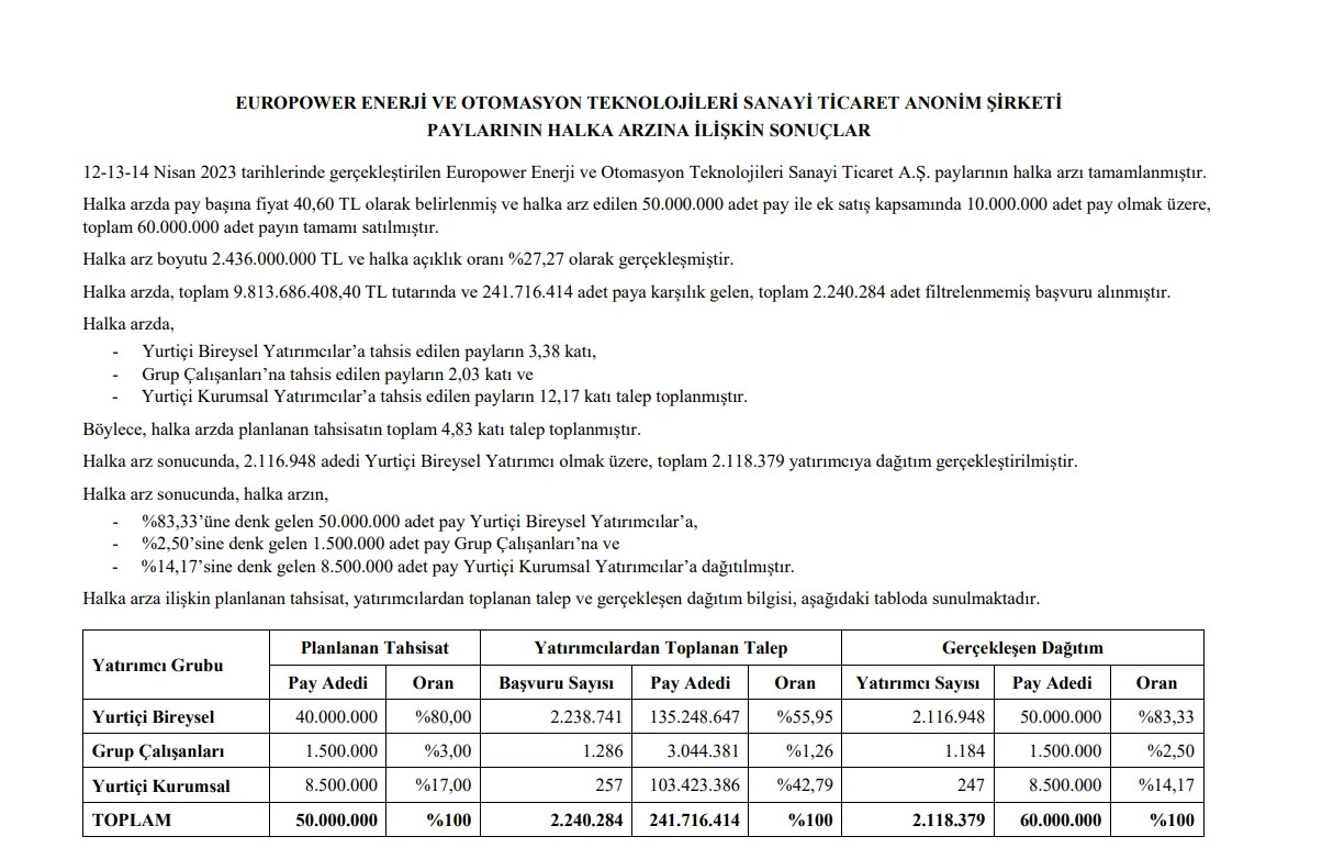 Europower halka arzına ilişkin sonuçlar Ak Yatırım Menkul Değerler tarafından Kamuyu Aydınlatma Platformu’nda (KAP) paylaşıldı. Peki EUPWR bireysel yatırımcıya kaç lot verdi? Halka arza aracılık eden Ak Yatırım’dan yapılan açıklamaya göre, Europower Enerji'nin halka arzında 60 milyon adet pay 40,60 TL fiyattan satıldı. Halka arzın yüzde 83,33’ü yurt içi bireysel, yüzde 14,17’si yurt içi kurumsal, yüzde 2,50’si ise grup çalışanlarına dağıtıldı. Buna göre bireysel yatırımcılara azami 24-25 lot hisse dağıtımı yapıldı. Halka arzda ayrıca 2.116.948 yurt içi bireysel yatırımcıya pay dağıtımı yapılarak, yeni bir rekor kırıldı. Kaynak: KAP Tıklayın: CWENE talep toplama ne zaman?
