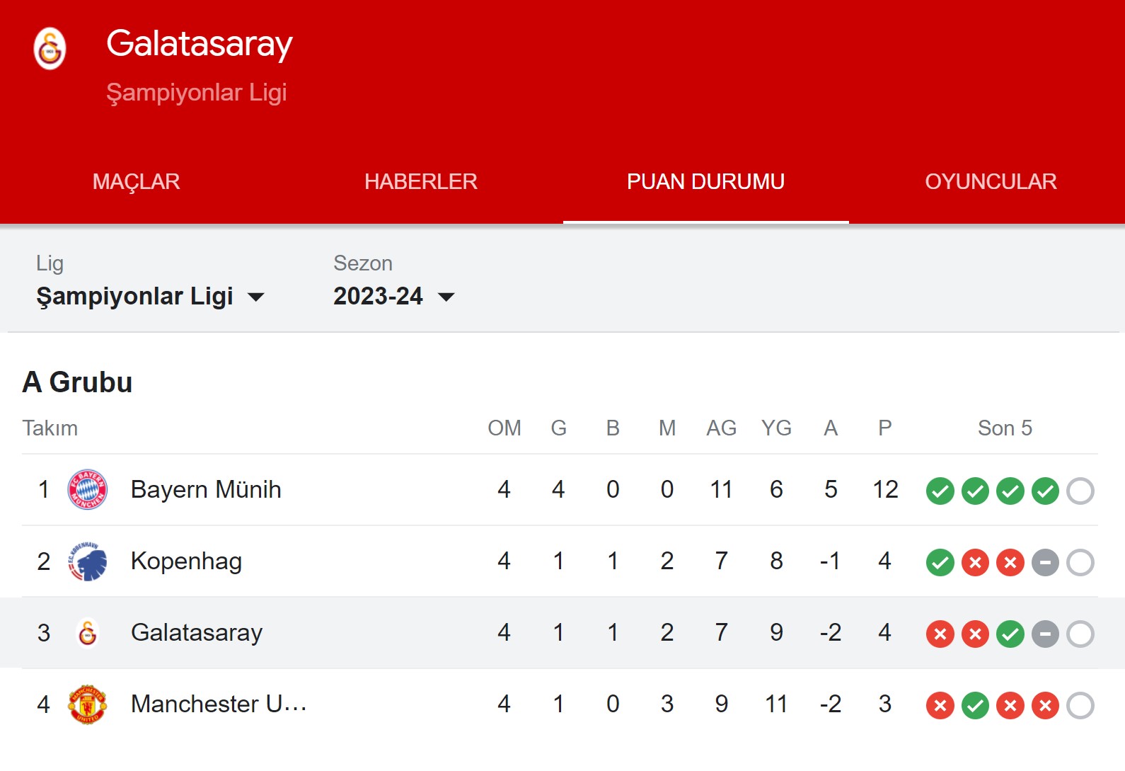 Galatasaray, Şampiyonlar Ligi maçları kapsamında Manchester United ve Kopenhag ile 2 kritik maça çıkacak. Bu iki maçı da Galatasaray’ın kazanması halinde kulüp kasasına 15,2 milyon euro girecek. Şampiyonlar Ligi'ndeki temsilcimiz Galatasaray, A grubunda kader maçlarına çıkacak. 29 Kasım'da Manchester United'ı kendi evinde ağırlayacak olan Galatasaray, 12 Aralık tarihinde ise Kopenhag ile deplasmanda kozlarını paylaşacak. İki müsabakayı da kazanıp adını son 16 turuna yazdırmak isteyen Galatasaray amacına ulaşması durumunda ise ciddi bir kazanç sağlayacak. NTV Spor'un aktardığına göre sarı-kırmızılılar olası iki galibiyetten 5,6 milyon euro, gruptan çıkma primi olarak da 9,6 milyon euroyla birlikte toplam 15,2 milyon euro kazanmış olacak. Galatasaray'ın bulunduğu A grubunda güncel puan durumu ise şöyle: [news_id:714619]
