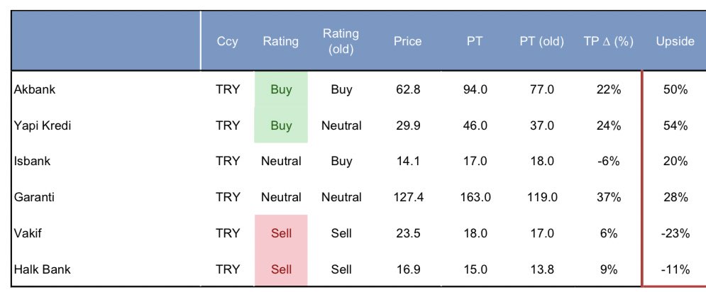 Goldman Sachs, gelecek hafta açıklanacak faiz kararı öncesinde Türk bankalarına ilişkin yatırım tavsiyelerini ve hedef fiyatlarını güncelledi. Goldman Sachs, Türk bankalarına ilişkin yatırım tavsiyeleri ve hedef fiyatlarında değişikliğe gitti. Aralık ayının Türk bankaları için makro katalizörler açısından hareketli bir ay olduğu belirtilen raporda, faiz indirimi döngüsünün başlangıcı, ücret artışları ve dezenflasyon sürecinin ardından Türk bankaları için yapılan değişiklikler şöyle sıralandı; Yapı ve Kredi Bankası hisseleri için yatırım tavsiyesi Nötr'den Al'a yükseltildi, Akbank için Al, Garanti Bankası için Nötr, Vakıf Bank ve Halk Bankası için SAT tavsiyesi yinelendi. Kurum İş Bankası için yatırım tavsiyesini ise Al'dan Nötr'e düşürdüğünü duyurdu. Hedef fiyat değişimleri Goldman Sachs, Akbank hisseleri için hedef fiyatını 77 TL'den 94 TL'ye, Yapı Kredi hisseleri için 37 TL'den 46 TL'ye, Garanti Bankası'nda 119 TL'den 163 TL'ye, Vakıf Bank'ta 17 TL'den 18 TL'ye, Halk Bank'ta 13,8 TL'den 15 TL'ye yükseltirken, İş Bankası C hisseleri için 18 TL'den 17 TL'ye düşürdü. [news_id:758804]