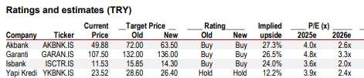 HSBC, Türk bankalarına yönelik yayımladığı yeni analiz raporunda, 4 bankanın hedef fiyatında revizyona gitti. HSBC, yayımladığı son değerlendirmede, Türk bankalarının gelişmekte olan piyasa (GEM) bankalarına karşı %65'lik bir iskontoyla işlem gördüğünü bildirdi. Türk bankalarındaki bu durumun iyi bir risk-ödül profili sunduğunu belirten HSBC, benzer seviyelerin döviz rezervleri son derece negatifken de görüldüğünü hatırlattı. Değerlendirmede, bazı bankaların hedef fiyatlarında aşağı yönlü revizyona gidilirken yatırım tavsiyelerinde ise değişiklik yapılmadı. Bu kapsamda HSBC, Akbank (AKBNK) için hedef fiyatını 72 TL’den 63,5 TL’ye düşürmesine rağmen bankaya yönelik "al" tavsiyesini korudu. Garanti BBVA (GARAN) için ise hedef fiyat 132 TL’den 136 TL’ye yükseltilirken hisseye ilişkin "al" tavsiyesi sabit tutuldu. İş Bankası C (ISCTR) için hedef fiyat 15,85 TL’den 14,30 TL’ye çekilirken tavsiye yine "al" olarak korunmaya devam etti. Yapı Kredi Bankası (YKBNK) için hedef fiyat ise 28,6 TL’den 26,4 TL’ye revize edilirken, bankaya yönelik tavsiye "tut" seviyesinde kaldı. Kaynak: HSBC [news_id:768853]