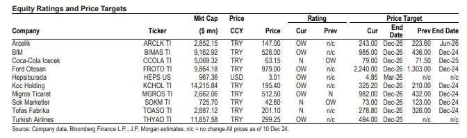 JPMorgan, yeni oluşturduğu UMS'29 modeli ile takip ettiği tüketici odaklı Türk şirketlerini değerlendirdi. 2025'e doğru, birçok şirketin büyümeyi sınırlı fiyat artışlarıyla dengelemeye çalışarak zorlu bir tüketici ortamını yönetmesini beklediklerini belirten JPMorgan analistleri, tüketici odaklı şirketlerin dezenflasyon ortamında istikrarlı marjları sürdürmekte zorlanacağını ve olası faiz indirimlerine rağmen yılın ilk yarısında sıkılaştırma baskılarını yönetmeye çalışacaklarını söyledi. Bu kapsamda BİM, Migros, Ford Otosan ve Tofaş Fabrika gibi öne çıkan şirketlerde reel kazanç artışı fırsatlarının sınırlı olacağını belirten JPMorgan, "Ancak 10 yıllık ortalamalara göre yaklaşık yüzde 40 ve uluslararası emsallerine göre yüzde 30 iskonto sunan değerlemeler hala düşük olduğu için değer fırsatlarının mevcut olduğuna inanıyoruz" dedi. "Bize göre, bu seviyelerden daha fazla yükseliş için, kazanç büyümesi ve risk primlerini azaltmak için zamanında faiz indirimlerinin bir kombinasyonuna ihtiyaç var" değerlendirmesinde bulunan JPMorgan, bu dinamikler çerçevesinde tavsiyelerini ve fiyat hedeflerini güncellediklerini duyurdu. Bu kapsamda Migros, "ağırlığını artır"a yükseltilirken; SOKM ve CCOLA "Nötr"'e indirildi. Banka konuyla ilgili paylaşımında, "En iyi seçimlerimiz arasında BIMAS, MGROS, FROTO ve ARCLK yer alıyor" değerlendirmesini yaptı. JPMorgan, takip ettiği Arçelik, BİM, Coca-Cola İçecek, Ford Otosan, Migros, Tofaş, Şok Marketler için hedef fiyatlarını Aralık 2026 olarak verirken THY için hedef fiyatını Aralık 2025 ve 494 TL olarak sürdürdü. Kaynak: CNBC-e [news_id:755456]