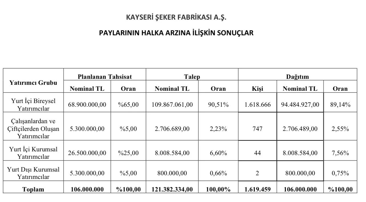 Kayseri Şeker Fabrikası AŞ’nin halka arz büyüklüğü 1,724 milyar TL olurken, bireysel yatırımcıya 58-59 lot dağıtım yapılması bekleniyor. Kayseri Şeker halka arzına ilişkin sonuçlar Gedik Yatırım Menkul Değerler tarafından Kamuyu Aydınlatma Platformu’nda paylaşıldı. Buna göre, 16,27 TL fiyat ile talep toplayan şirketin halka arz büyüklüğü 1.724.620.000 TL oldu. Halka arzı sırasında toplamda 106 milyon adet lot (hisse adedi) dağıttı. Böylelikle şirket hisselerini %15,01 oranında halka arz etmiş oldu. Kayseri Şeker (KAYSE) kaç lot verdi? Halka arzda 1.618.666 Yurtiçi Bireysel Yatırımcıya toplam 94.484.927 adet pay dağıtımı yapılırken, her başvuru yapan yatırımcıya ortalama 58-59 lot (943-959 TL) dağıtım gerçekleştiği hesaplanmaktadır. Kayseri Şeker (KAYSE) borsada ne zaman işlem görecek? Kayseri Şeker’in “KAYSE” koduyla 17 ya da 18 Mayıs’ta Borsa İstanbul’da işlem görmeye başlaması beklenmektedir. Kaynak: KAP Tıklayın: Bien Yapı halka arz sonucu açıklandı: BİENY kaç lot verdi?