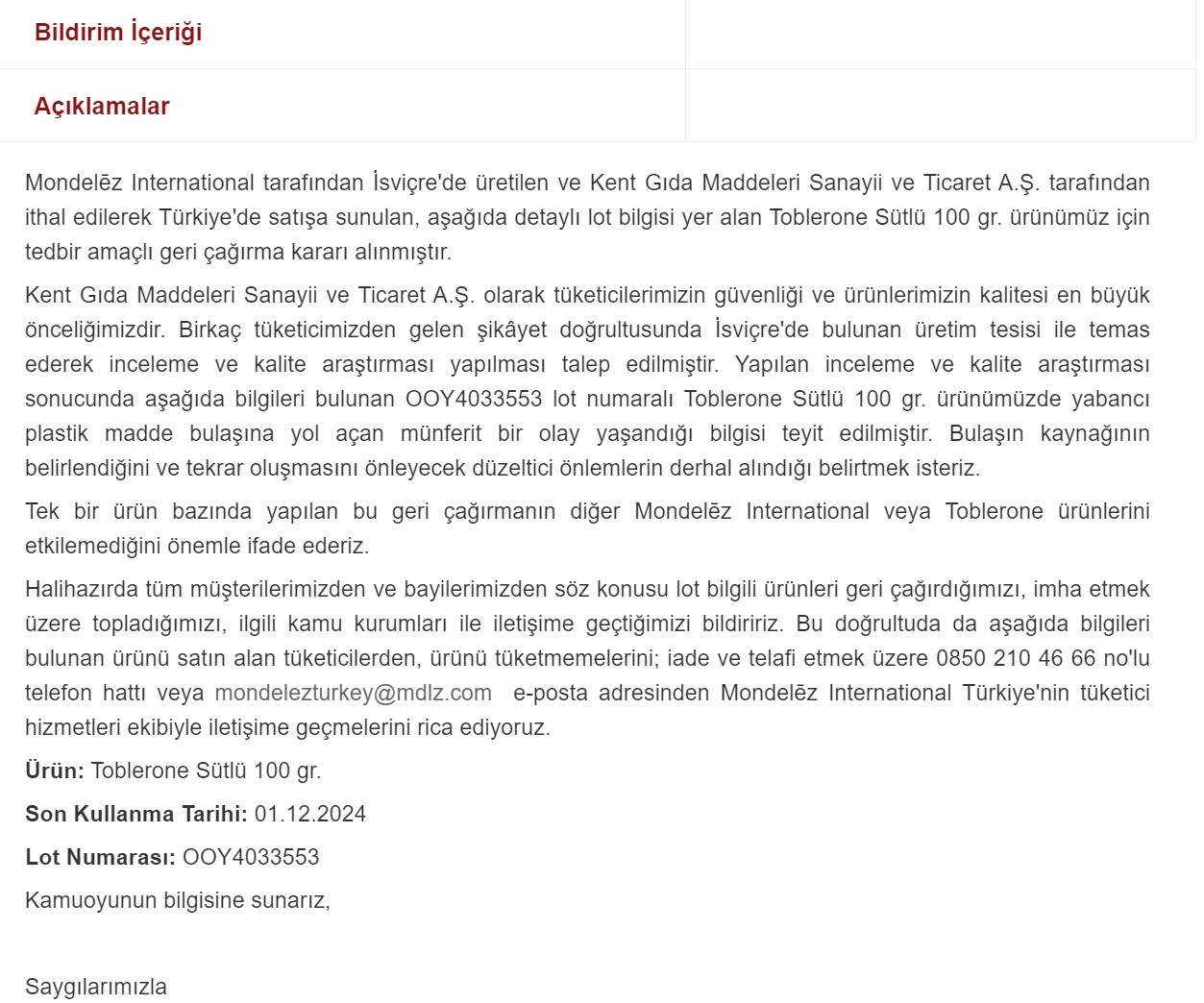 Kent Gıda, Türkiye'de satılan Toblerone sütlü 100 gramlık çikolataları imha etmek üzere geri çağırma kararı aldığını Kamuoyu Aydınlatma Platformu'na bildirdi. Kent Gıda, İsviçre'den ithal edip Türkiye'de sattığı Toblerone sütlü çikolata ürünü için geri çağırma kararı aldı. Açıklamada "Toblerone Sütlü 100 gr. ürünümüzde yabancı plastik madde bulaşına yol açan münferit bir olay yaşandığı bilgisi teyit edilmiştir" denildi. Şirketten KAP'a yapılan açıklamada "Mondelēz International tarafından İsviçre'de üretilen ve Kent Gıda Maddeleri Sanayii ve Ticaret A.Ş. tarafından ithal edilerek Türkiye'de satışa sunulan, aşağıda detaylı lot bilgisi yer alan Toblerone Sütlü 100 gr. ürünümüz için tedbir amaçlı geri çağırma kararı alınmıştır" denildi. Konuyla ilgili KAP’a yapılan açıklamada ise şunlar kaydedildi: "Kent Gıda Maddeleri Sanayii ve Ticaret A.Ş. olarak tüketicilerimizin güvenliği ve ürünlerimizin kalitesi en büyük önceliğimizdir. Birkaç tüketicimizden gelen şikâyet doğrultusunda İsviçre'de bulunan üretim tesisi ile temas ederek inceleme ve kalite araştırması yapılması talep edilmiştir. Yapılan inceleme ve kalite araştırması sonucunda aşağıda bilgileri bulunan OOY4033553 lot numaralı Toblerone Sütlü 100 gr. ürünümüzde yabancı plastik madde bulaşına yol açan münferit bir olay yaşandığı bilgisi teyit edilmiştir. Bulaşın kaynağının belirlendiğini ve tekrar oluşmasını önleyecek düzeltici önlemlerin derhal alındığı belirtmek isteriz. Tek bir ürün bazında yapılan bu geri çağırmanın diğer Mondelēz International veya Toblerone ürünlerini etkilemediğini önemle ifade ederiz. Halihazırda tüm müşterilerimizden ve bayilerimizden söz konusu lot bilgili ürünleri geri çağırdığımızı, imha etmek üzere topladığımızı, ilgili kamu kurumları ile iletişime geçtiğimizi bildiririz. Bu doğrultuda da aşağıda bilgileri bulunan ürünü satın alan tüketicilerden, ürünü tüketmemelerini; iade ve telafi etmek üzere 0850 210 46 66 no'lu telefon hattı veya mondelezturkey@mdlz.com e-posta adresinden Mondelēz International Türkiye'nin tüketici hizmetleri ekibiyle iletişime geçmelerini rica ediyoruz. Ürün: Toblerone Sütlü 100 gr. Son Kullanma Tarihi: 01.12.2024 Lot Numarası: OOY4033553" Kaynak: KAP