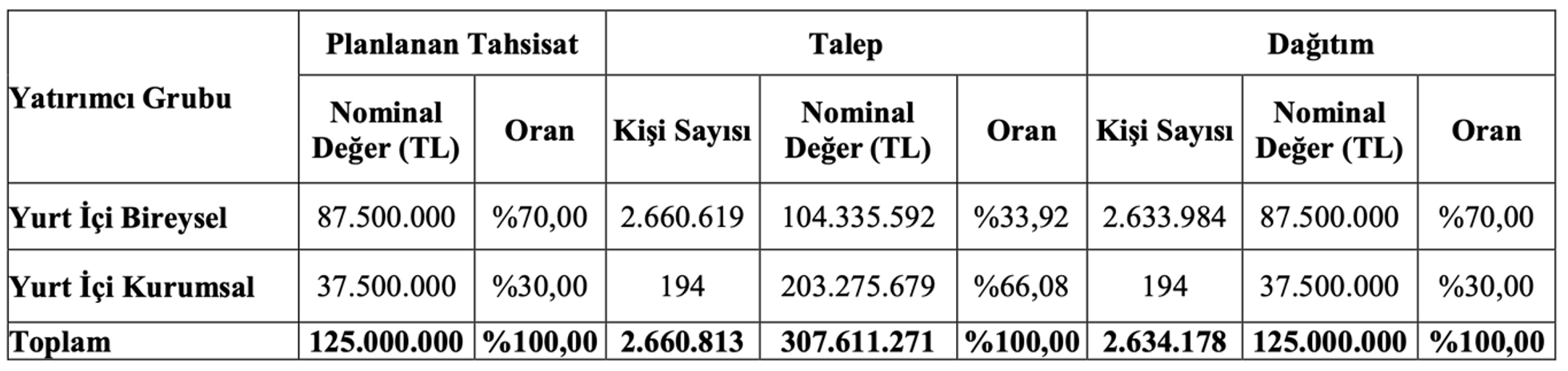 Koç Metalurji A.Ş. paylarının 9-10 Mayıs 2024 tarihleri arasında gerçekleşen halka arzına ilişkin sonuçlar açıklandı. Koç Metalurji halka arzında 20,5 TL’den satışa sunulan 125 milyon TL nominal değerli payların tamamı satıldı. Buna göre Koç Metalurji'nin toplam halka arz büyüklüğü 2.562.500.000 TL oldu. Halka arza 2,46 katı talep geldi Şirket tarafından KAP’a yapılan açıklamada halka arz sürecinde yurt içi bireysel yatırımcılardan planlanan tahsisat tutarının yaklaşık 1,19 katı, yurt içi kurumsal yatırımcılardan ise planlanan tahsisat tutarının yaklaşık 5,42 katı talep geldiği bilgisi verildi. Böylece halka arzda toplam 125 milyon TL nominal değerli paylar için planlanan satış tutarının yaklaşık 2,46 katı talep geldi. Koç Metalurji'nin halka arzında toplamda 2.634.178 yatırımcıya pay dağıtımı gerçekleştirilirken bireysel yatırımcılara kişi başına ortalama 34 lot (697 TL) dağıtılmış oldu. Koç Metalurji A.Ş. paylarının halka arzında, yatırımcı grubu bazında talep ve dağıtım bilgisi şu şekilde: Kaynak. KAP [news_id:732811]