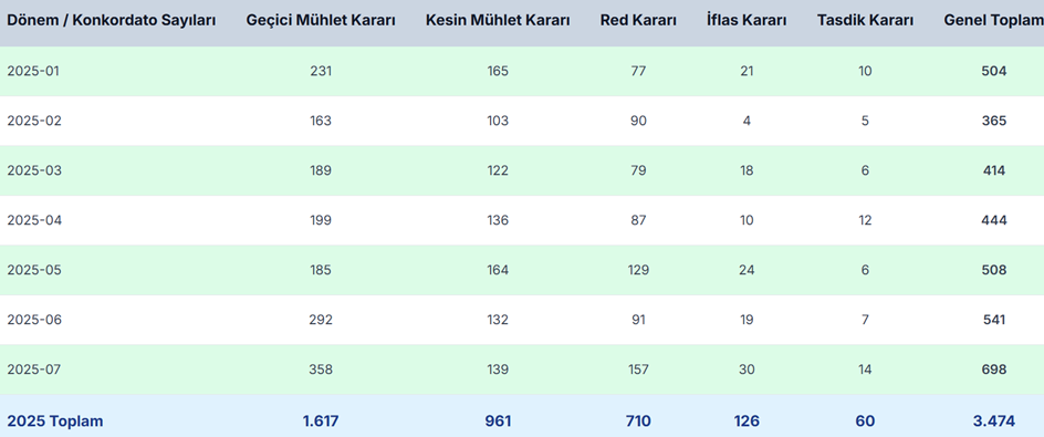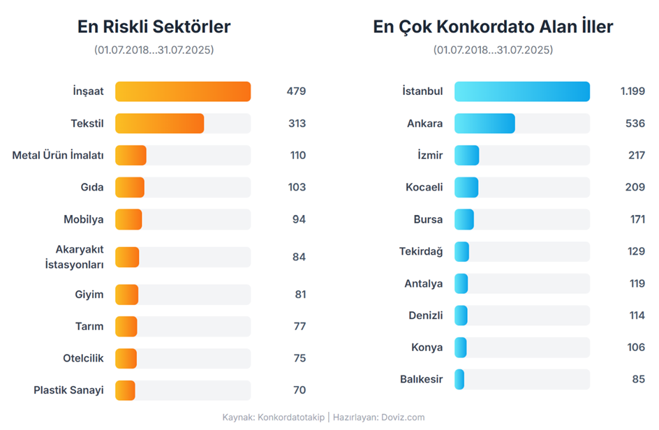 Türkiye genelinde şirketlerin konkordato başvuruları temmuz ayında yılın en yüksek seviyesine ulaştı. Peki, bu dönemde en riskli sektörler hangileri oldu? İşte detaylar.. Konkordato Takip platformunun verilerine göre temmuz ayında 698 şirket konkordato talebinde bulundu. Bunların 30’u için iflas, 358’i için geçici mühlet, 139’u için ise kesin mühlet kararı verildi. İlgili veriler, geçici mühlet kararı verilen ve iflası onaylanan şirket sayısının yılın yeni zirvesine ulaştığını gösterdi. Yılın ilk yedi aylık verilerine bakıldığında ise geçici mühlet kararı verilen firma sayısının 1.617’ye, kesin mühlet kararı verilen dosya sayısının ise 961’e çıktığı görüldü. Bu dönemde iflasına karar verilen şirket sayısı da 126 oldu. Kaynak: Konkordatotakip En riskli sektörler Konkordato talebinde bulunan şirketlerin sektörel dağılıma bakıldığında ise en kırılgan sektörünün inşaat olmaya devam ettiği görüldü. 479 şirketle listenin başında yer alan inşaatı, 313 başvuruyla tekstil ve 110 başvuruyla metal ürün imalatı takip etti. Bu sektörleri sırasıyla gıda, mobilya ve akaryakıt istasyonları izledi. 2024 yılında konkordato rekoru tekstil sektöründe gerçekleşmişti. İlgili veriler ayrıca ekonomik darboğazın etkisinin en çok büyükşehirlerde hissedildiğini ortaya koydu. Buna göre en çok konkordato alan illerin başında 1199 ile İstanbul, 536 ile Ankara, 217 ile İzmir geldi. Bu illeri sırasıyla Kocaeli, Bursa, Tekirdağ, Antalya, Denizli, Konya ve Balıkesir izledi. Kaynak: Konkordatotakip [news_id:779913]