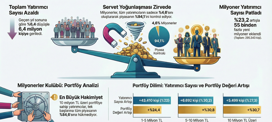 Borsa İstanbul'da kasım sonu itibarıyla yatırımcı sayısı yüzde 6,4 azalırken pay senedi yatırımcılarının yüzde 4,6'sını oluşturan milyonerler, yatırımlarıyla 7 trilyon 283 milyar 680 milyon liralık toplam pay senedi piyasasının yüzde 94,1'ini elinde tuttu. Merkezi Kayıt Kuruluşu (MKK) verilerinden derlenen bilgilere göre Borsa İstanbul'da pay senedindeki toplam yatırımcı sayısı kasım sonu itibarıyla geçen yılın sonuna göre yüzde 6,4 azalarak 6 milyon 431 bin 980'e geriledi. Bu dönemde yatırımcıların toplam portföy değeri 5 trilyon 711 milyar 806 milyon liradan, 7 trilyon 283 milyar 680 milyon liraya yükseldi. Geçen yılın sonuna göre bakıldığında kasım ayı itibarıyla "1 milyon lira üzeri" portföy diliminde yer alan "milyoner" yatırımcı sayısında ve bu dilimin portföy büyüklüğünde artış görüldü. "Milyoner" yatırımcı sayısı geçen yılın sonunda 239 bin 742 iken, kasım itibarıyla yüzde 23,2 yükselişle 295 bin 343'e yükseldi. Böylece, Borsa İstanbul'a 55 bin 601 yeni "milyoner" yatırımcı eklendi. Aynı dönemde bu yatırımcıların yönettiği toplam portföy büyüklüğü de 5 trilyon 263 milyar 224 milyon liradan, 6 trilyon 852 milyar 788 milyon liraya çıktı. Kasım ayı itibarıyla sayıca toplam pay senedi yatırımcılarının yüzde 4,6'sını oluşturan bu grup, yatırımlarıyla 7 trilyon 283 milyar 680 milyon liralık toplam pay senedi piyasasının yüzde 94,1'ini elinde bulunduruyor. En çok yatırımcı "1-5 milyon lira" grubuna katıldı Pay senedinde "milyoner" yatırımcı portföyleri, MKK verilerinde 1-5 milyon lira, 5-10 milyon lira ve 10 milyon lira üzeri olmak üzere üç ayrı dilimde takip ediliyor. Buna göre, 1-5 milyon lira grubuna 1 milyon liranın üzerindeki ve 5 milyon liraya kadar olan portföyler, 5-10 milyon lira grubuna ise 5 milyon liranın üzerindeki ve 10 milyon liraya kadar olan portföyler dahil ediliyor. 10 milyon lira üzeri sınıfı ise bu tutarın üzerindeki tüm portföyleri kapsıyor. "Milyoner" yatırımcılar bu üç portföy dilimine göre incelendiğinde, Kasım 2025 itibarıyla geçen yılın sonuna göre sayısal olarak en fazla yatırımcı girişinin "1-5 milyon lira" grubunda, oransal olarak ise "5-10 milyon lira" grubunda gerçekleştiği görüldü. Portföy değerine göre ise oransal olarak en fazla artış "5-10 milyon lira" grubunda görüldü. Aralık 2024'te 197 bin 469 yatırımcıdan oluşan bu grup, kasım ayı itibarıyla yüzde 22 yükselişle 43 bin 410 kişi artarak 240 bin 879'a yükseldi. Bu dilimdeki yatırımcıların toplam portföy büyüklüğü de yüzde 24,4 artışla 394 milyar 704 milyon liradan 490 milyar 955 milyon liraya çıktı. Aynı dönemde "5-10 milyon lira" aralığındaki yatırımcı sayısında da artış görülürken, bu gruptaki yatırımcı sayısı yüzde 30,2 artışla 6 bin 692 kişi yükselerek 28 bin 836'ya ulaştı. Grubun portföy değeri ise yüzde 30,8 yükselişle 152 milyar 79 milyon liradan 198 milyar 867 milyon liraya ulaştı. "10 milyon lira üzeri" dilimde ise yatırımcı sayısı yüzde 27,3 yükselişle 5 bin 499 kişi yükselerek 25 bin 628'e ulaştı. Bu kategorinin portföy değeri de yüzde 30,7 artışla 4 trilyon 716 milyar 441 milyon liradan, 6 trilyon 162 milyar 966 milyon liraya yükseldi. Böylece kasım ayı itibarıyla bu gruptaki yatırımcıların tek başına tüm pay senedi piyasasının yüzde 84,6'sını elinde bulundurduğu görüldü. Fon piyasasında da ibre "milyoner"den yana Kasım 2025 itibarıyla, "Fon" ile "Devlet İç Borçlanma Araçları" piyasalarında da benzer bir tablo oluştu. Bu dönemde, fon piyasasında 1 milyon lira üzeri portföye sahip 559 bin 397 yatırımcının portföy değeri 7 trilyon 818 milyar 135 milyon liraya ulaştı. Bu tutar, toplam fon pazarının yüzde 95,7'sini oluşturdu. Devlet İç Borçlanma Araçları tarafında ise 17 bin 504 "milyoner" yatırımcı, 2 trilyon 65 milyar 244 milyon liralık portföyüyle toplam Devlet İç Borçlanma Araçları piyasasının yüzde 99,9'unu elinde tutuyor.
