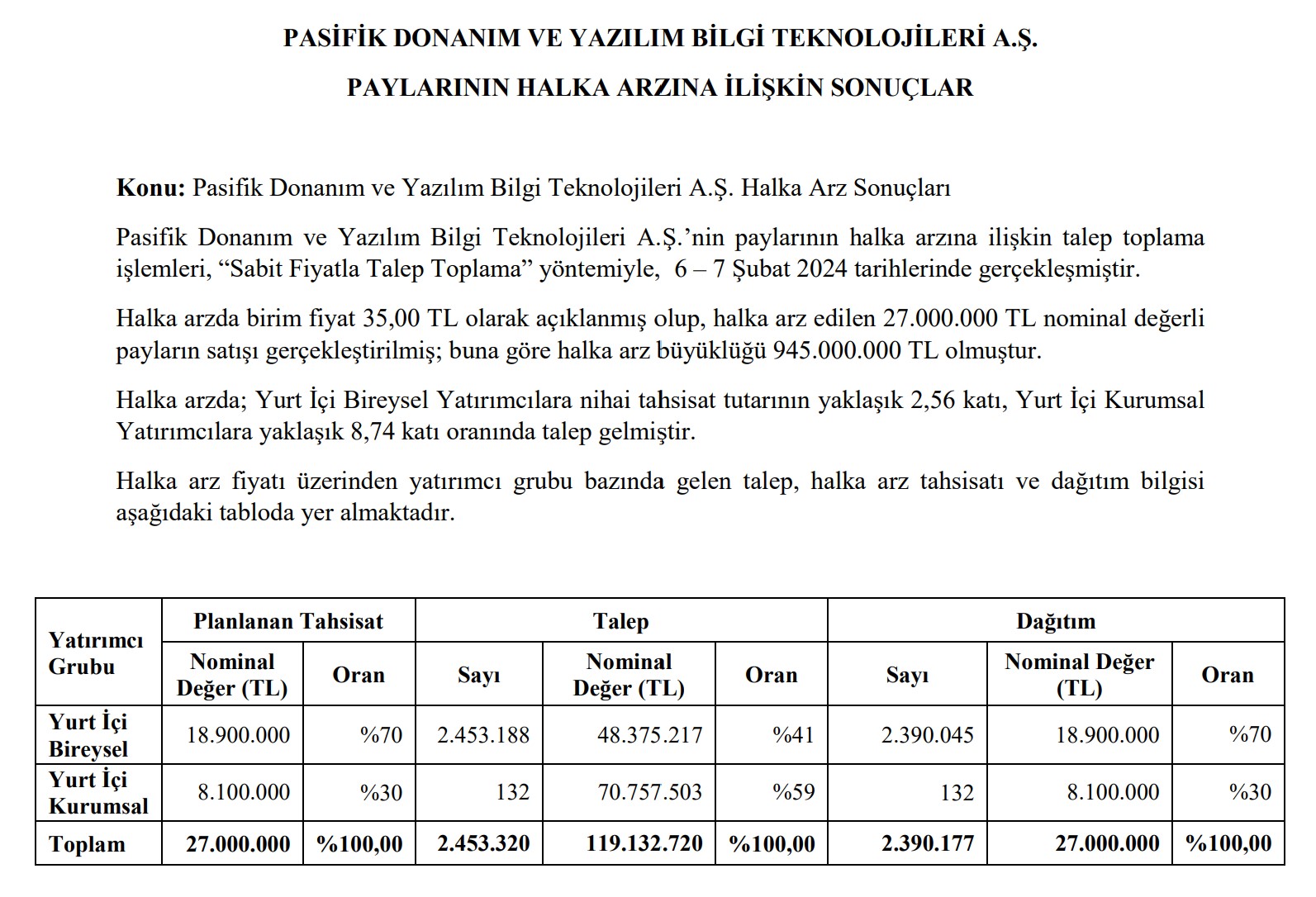 Pasifik Teknoloji halka arzında talep toplamanın tamamlanmasının ardından halka arz sonuçları da Kamuyu Aydınlatma Platformu’nda yayımlandı. Peki, PATEK bireysel yatırımcıya kaç lot verdi? İşte detaylar.. Borsa İstanbul’da uzun bir aradan sonra yeniden başlayan halka arz rüzgarı bu hafta 2 yeni halka arz heyecanı ile devam etti. Pasifik Grubu’nun borsadaki 4. şirketi olmaya hazırlanan Pasifik Teknoloji ve Yazılım Bilgi Teknolojileri A.Ş. (PATEK) halka arzında talep toplamanın tamamlanmasının ardından ise resmi halka arz sonuçları Halk Yatırım menkul Değerler A.Ş. tarafından Kamuyu Aydınlatma Platformu’nda yayımlandı. Buna göre Halk Yatırım tarafından paylaşılan metinde, halka arz sonuçlarına ilişkin şunlar kaydedildi: Pasifik Donanım ve Yazılım Bilgi Teknolojileri A.Ş.’nin paylarının halka arzına ilişkin talep toplama işlemleri, “Sabit Fiyatla Talep Toplama” yöntemiyle, 6 – 7 Şubat 2024 tarihlerinde gerçekleşmiştir. Halka arzda birim fiyat 35,00 TL olarak açıklanmış olup, halka arz edilen 27.000.000 TL nominal değerli payların satışı gerçekleştirilmiş; buna göre halka arz büyüklüğü 945.000.000 TL olmuştur. Halka arzda; Yurt İçi Bireysel Yatırımcılara nihai tahsisat tutarının yaklaşık 2,56 katı, Yurt İçi Kurumsal Yatırımcılara yaklaşık 8,74 katı oranında talep gelmiştir. Halka arz fiyatı üzerinden yatırımcı grubu bazında gelen talep, halka arz tahsisatı ve dağıtım bilgisi aşağıdaki tabloda yer almaktadır. Kaynak: KAP KAP’ta yayımlanan sonuçlara göre bireysel yatırımcılara kişi başı azami 7-8 lot hisse dağıtımı yapıldı. Öte yandan Pasifik Teknoloji ve Yazılım Bilgi Teknolojileri A.Ş. (PATEK) paylarının halka arzında, payların %5`inden fazlasını alan gerçek/tüzel kişi bulunmadı. Diğer halka arzlarla ilgili daha fazla bilgiye sahip olabilmek için Halka Arz sekmemizi takip edebilirsiniz.