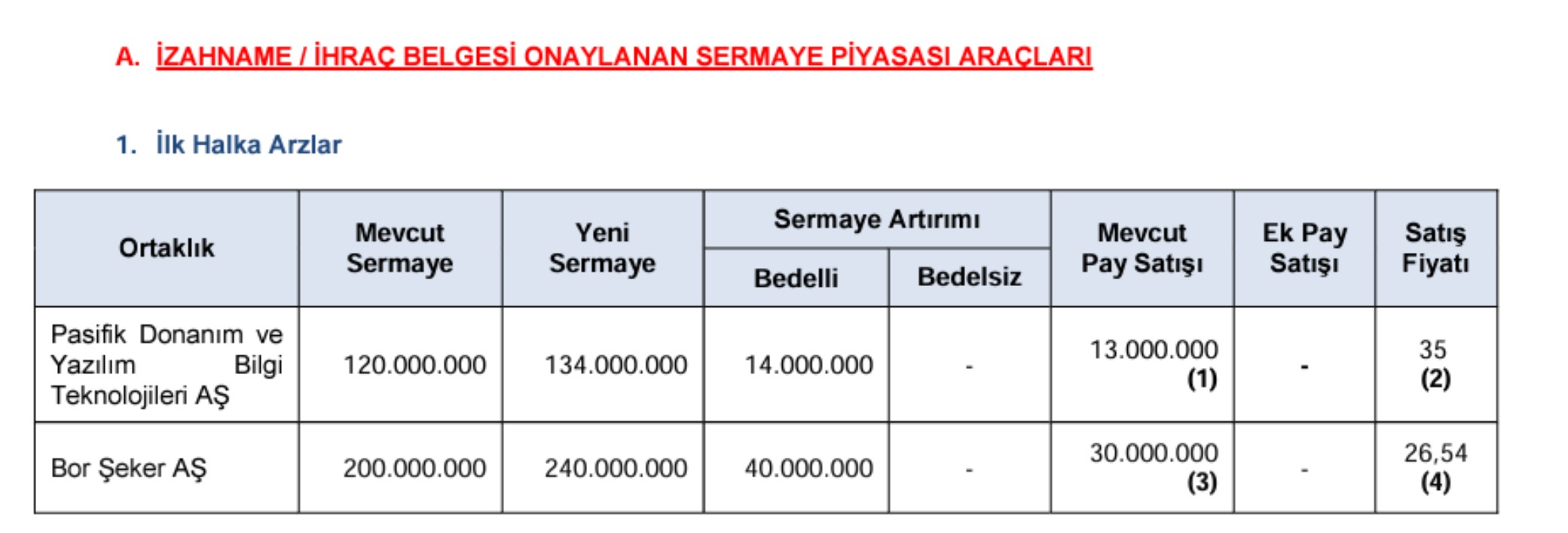 Sermaye Piyasası Kurulu (SPK), Pasifik Donanım ve Yazılım Bilgi Teknolojileri AŞ ve Bor Şeker AŞ'nin halka arzına onay verdi. Sermaye Piyasası Kurulu 2024 yılının 7. bültenini yayımladı. Yayımlanan yeni bültene göre kurul, Pasifik Donanım ve Yazılım Bilgi Teknolojileri AŞ'nin 35 liradan, Bor Şeker AŞ'nin 26,54 liradan halka arz başvurusuna onay verdi. Kaynak: SPK Bülteni 2024/7 Borçlanma aracı ihraç başvurusuna izin verilen şirketler arasında 500 milyon lirayla İstanbul Varlık Yönetim AŞ, 264 milyon lirayla Akdeniz Faktoring AŞ, 8 milyar lirayla Yapı Kredi Yatırım Menkul Değerler AŞ, 1 milyar 200 milyon lirayla Mercedes Benz Kamyon Finansman AŞ ve 760 milyon lirayla Tam Finans Faktoring AŞ de yer aldı. Aktif Portföy Yönetimi AŞ Playgate Girişim Sermayesi Yatırım Fonu’nun kuruluşuna izin verilmesi ve katılma paylarının ihracına ilişkin ihraç belgesinin onaylanması talebinin olumlu karşılanmasına karar verildiğini bildirdi. Kurul, A1 Portföy Yönetimi AŞ Birinci Gayrimenkul Yatırım Fonu ve A1 Portföy Yönetimi AŞ İkinci Gayrimenkul Yatırım Fonu'nun kuruluşlarına izin verilmesi taleplerinin olumlu karşıladığını açıkladı. SPK'den yapılan açıklamada ayrıca şunlar kaydedildi: "Colendi Menkul Değerler AŞ’nin mevcut faaliyet izinlerine ek olarak, paya dayalı türev araçlar, pay endeksine dayalı türev araçlar, diğer türev araçlar kapsamında işlem aracılığı, yatırım danışmanlığı ve en iyi gayret aracılığı faaliyetinde bulunmasına izin verilmesi talebinin olumlu karşılanmasına karar verilmiştir. Açı Kurumsal Gayrimenkul Değerleme ve Danışmanlık AŞ, Kurulumuzun Makine ve Ekipmanları Değerlemeye Yetkili Kuruluşlar listesine alındı." [news_id:722768]