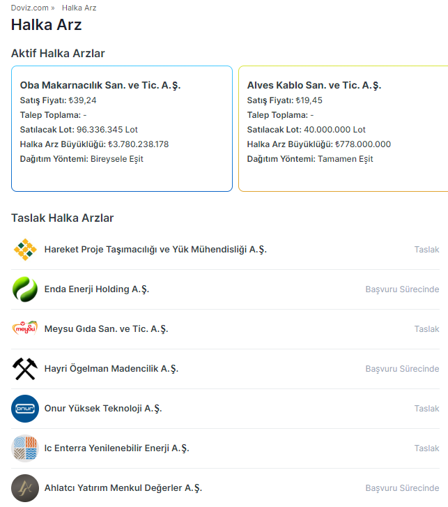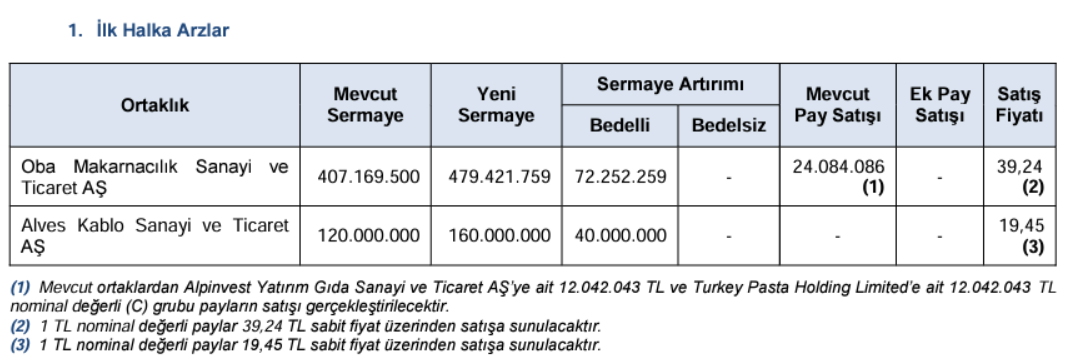 Sermaye Piyasası Kurulu (SPK), iki şirketin daha ilk halka arz başvurusuna onay verdi. Sermaye Piyasası Kurulu, 2024 yılının 11. bültenini yayımladı. Buna göre bültende Kurul, Oba Makarnacılık Sanayi ve Ticaret AŞ ile Alves Kablo Sanayi ve Ticaret AŞ'nin ilk halka arzının onaylandığını duyurdu. SPK bültenine göre Kurul, Oba Makarnacılık Sanayi ve Ticaret AŞ'nin pay başına 39,24 liradan, Alves Kablo Sanayi ve Ticaret AŞ'nin pay başına 19,45 liradan halka arz başvurusunu onayladı. Kaynak: SPK Bülteni 2024/11 Diğer halka arzlarla ilgili daha fazla bilgiye sahip olabilmek için Halka Arz sekmemizi takip edebilirsiniz. Kaynak: Doviz.com - Halka Arz Bültendeki diğer detaylar Bosch Fren Sistemleri Sanayi ve Ticaret AŞ'nin 28 milyon 136 bin 683 lira tutarındaki bedelsiz sermaye artırımı başvurusuna onay veren SPK, Yapı ve Kredi Bankasının 5 milyar lira, İnfo Yatırım Menkul Değerler AŞ’nin 1 milyar 500 milyon lira, Beyaz Filo Oto Kiralama AŞ’nin 300 milyon lira, Atılım Faktoring AŞ’nin 75 milyon lira, Sarten Ambalaj Sanayi ve Ticaret AŞ’nin 1 milyar lira, Trive Yatırım Menkul Değerler AŞ’nin 292 milyon 500 bin lira, ICA İçtaş Altyapı Yavuz Sultan Selim Köprüsü ve Kuzey Çevre Otoyolu Yatırım ve İşletme AŞ’nin 500 milyon dolar tutarındaki borçlanma aracı ihracı başvurusunu kabul etti. Kurul, ayrıca Akın Tekstil AŞ (ATEKS) pay piyasasında 5 Temmuz 2023-7 Ağustos 2023 döneminde gerçekleştirilen işlemlerle ilgili inceleme sonucu 1 kişiye 2 milyon 24 bin 168,50 lira idari para cezası uygulanmasına ve Türkiye’de yerleşik kişilere yönelik internet aracılığıyla yurt dışında kaldıraçlı işlem yaptırıldığı belirlenen 45 internet sitesine erişimin engellenmesi için gerekli hukuki işlemlerin yapılmasına hükmetti. [news_id:724452]