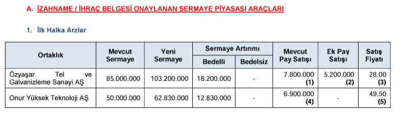 Sermaye Piyasası Kurulu (SPK), iki yeni halka arza onay verdi. Sermaye Piyasası Kurulu, 2024 yılının 25. bültenini yayımladı. Buna göre bültende Kurul, Özyaşar Tel ve Galvanizleme Sanayi AŞ ile Onur Yüksek Teknoloji AŞ'nin ilk halka arzını onayladı. Özyaşar Tel halka arzında mevcut ortaklardan Çokyaşar Holding AŞ’nin sahip olduğu 6.240.000 TL, Derviş Ali ÇOKYAŞAR’ın sahip olduğu 780.000 TL ve Ömer ÇOKYAŞAR’ın sahip olduğu 780.000 TL nominal değerli olmak üzere toplam 7.800.000 TL nominal değerli (B) grubu pay halka arz edilecek. Fazla talep gelmesi halinde mevcut ortaklardan Çokyaşar Holding AŞ’ye ait 4.160.000 TL, Derviş Ali ÇOKYAŞAR’a ait 520.000 TL ve Ömer ÇOKYAŞAR’a ait 520.000 TL nominal değerli (B) grubu payın ek satışı gerçekleştirilebilecek. 1 TL nominal değerli paylar 28,00 TL sabit fiyat üzerinden satışa sunulacak. Onur Yüksek Teknoloji halka arzında mevcut ortaklardan Cengiz DEDE’nin sahip olduğu 3.200.000 TL, Noyan Burçin DEDE’nin sahip olduğu 1.600.000 TL, Tolga DEDE’nin sahip olduğu 1.600.000 TL ve Nurgül DEDE’nin sahip olduğu 500.000 TL nominal değerli olmak üzere toplam 6.900.000 TL nominal değerli (B) grubu pay halka arz edilecek. 1 TL nominal değerli paylar 49,50 TL sabit fiyat üzerinden satışa sunulacak. Kaynak: SPK/Bülten No: 2024-25 Bültendeki diğer detaylar Birko Birleşik Koyunlular Mensucat Ticaret ve Sanayi AŞ'nin 20 milyon lira tutarındaki bedelli sermaye artırımına, Zedur Enerji Elektrik Üretim AŞ'nin 149 milyon 750 bin lira ve Sanica Isı Sanayi AŞ'nin 465 milyon lira tutarındaki bedelsiz sermaye artırımına onay veren SPK, Sasa Polyester Sanayi AŞ ve Derlüks Yatırım Holding AŞ'nin tahsisli sermaye artırımı başvurusunu kabul etti. Kurul, Atılım Faktoring AŞ'nin 50 milyon lira, İş Faktoring AŞ'nin 1 milyar lira, QNB Finans Faktoring AŞ'nin 500 milyon lira, ZİP Finansman AŞ'nin 40 milyon lira, Fiba Faktoring AŞ'nin 325 milyon lira tutarındaki borçlanma aracı ihracı başvurusunu onayladı. SPK, Trive Portföy Yönetimi AŞ Trive Girişim Sermayesi Yatırım Fonunun kuruluşuna izin verilmesi talebinin olumlu karşılanmasına karar verdi. Plastikkart Akıllı Kart İletişim Sistemleri Sanayi ve Ticaret AŞ pay piyasasında gerçekleştirilen işlemlerle ilgili olarak yapılan inceleme sonucunda 1 kişiye 12 milyon 707 bin 856,10 lira idari para cezası uygulanmasına hükmeden SPK, adına kayıtlı telefon hattını kullandırarak izinsiz sermaye piyasası faaliyeti bulunması sebebiyle 12 telefon hattının sahipleri ile 12 kişiye ve 9 ayrı internet sitesi içerik sağlayıcısına suç duyurusu yapılmasına karar verdi. Kurul, Türkiye'de yerleşik kişilere yönelik olarak internet aracılığıyla yurt dışında kaldıraçlı işlem yaptırıldığı belirlenen 54 internet sitesine erişimin engellenmesi için gerekli hukuki işlemlerin yapılmasını kararlaştırdı. [news_id:733466]