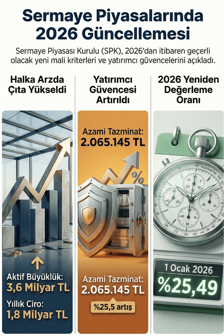 Sermaye Piyasası Kurulu, 2026 yılından itibaren geçerli olacak yeniden değerleme oranlarını ve halka arz için gerekli mali kriterleri güncelledi. Sermaye Piyasası Kurulu (SPK), 6362 sayılı Sermaye Piyasası Kanunu ve ilgili alt düzenlemeler çerçevesinde 2026 yılı için uygulanacak yeniden değerleme oranlarını belirledi. Kurul tarafından yayımlanan bültene göre, 1 Ocak 2026 ile 31 Aralık 2026 tarihleri arasındaki dönem için yeniden değerleme oranı yüzde 25,49 olarak tespit edildi. Söz konusu oran, 2025 yılı için yüzde 43,93 seviyesinde uygulanıyordu. Halka arz kriterlerinde çıta yükseldi Yeni düzenleme ile birlikte halka açılmak isteyen şirketlerin sağlaması gereken mali eşiklerde de artışa gidildi. Halka arz başvurusunda bulunacak şirketler için daha önce 2,4 milyar lira olarak uygulanan aktif büyüklük şartı 3,6 milyar liraya çıkarıldı. Benzer şekilde, 1,2 milyar lira olan yıllık ciro şartı da 1,8 milyar lira seviyesine yükseltildi. Bu değişiklikler, sermaye piyasalarına dahil olacak kurumların ölçeklerinin büyümesini hedefliyor. Yatırımcı tazmin tutarları artırıldı Yatırımcıları koruma altına alan tazmin limitleri de 2026 yılı için yeniden revize edildi. Yatırımcı Tazmin Merkezi tarafından hak sahiplerine ödenebilecek azami tazmin tutarı, yüzde 25,5 oranındaki artışla 2 milyon 65 bin 145 liraya ulaştı. Ayrıca Özel Fon üzerinden gerçekleştirilecek ödemelerde azami tutarın 416 bin 934 lira olarak uygulanmasına karar verildi.